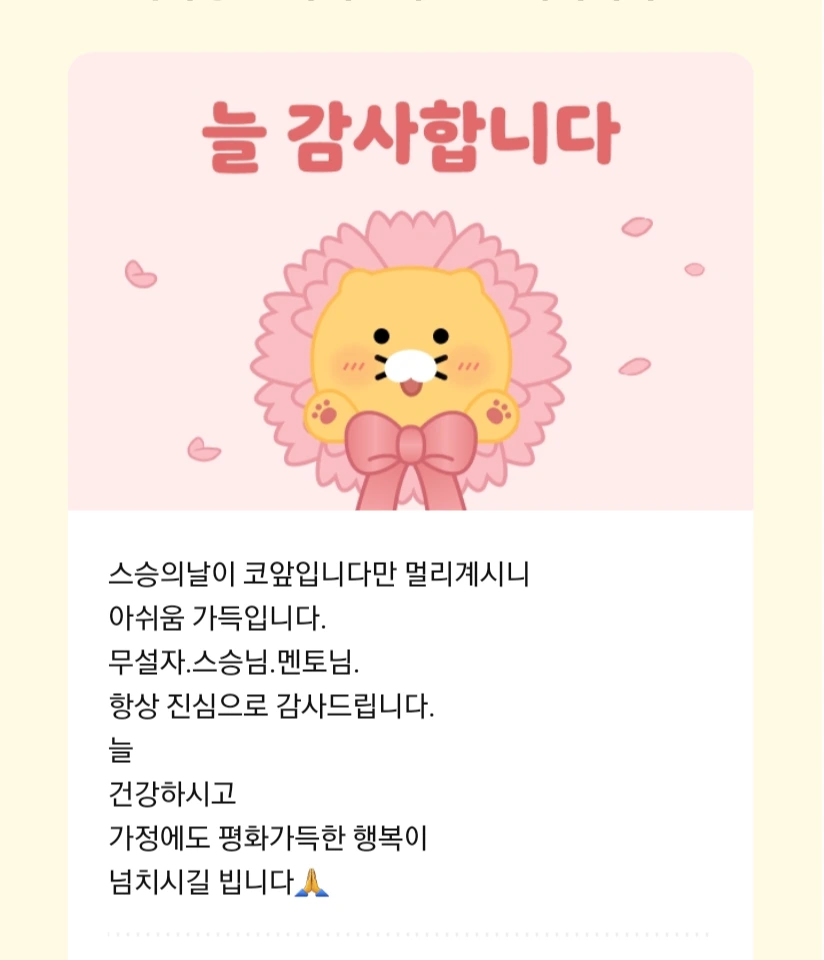 이 나이에 스승의 날이 내게도 이렇게 의미 있는 날로 다가올 줄 미처 몰랐다. 치레로 하는 말이 아니라 진심을 담아 배우고 있으시니 다우 분의 멘토로서 글쓰기에 정성을 다해야겠다고 마음을 다진다. 오늘만큼은 나도 '스승의 날'을 맞아 세상의 어느 스승보다 보람과 자부심을 가져보는 날이다.