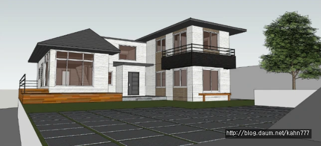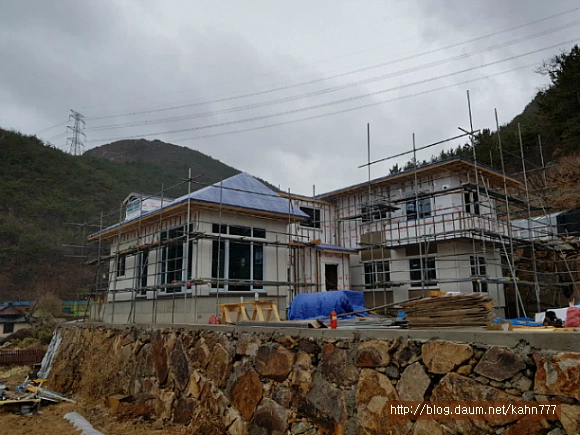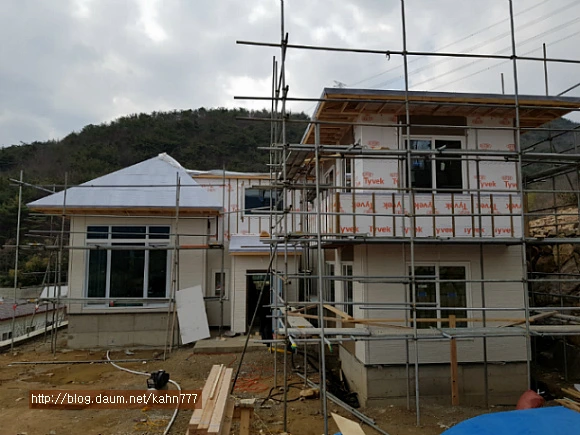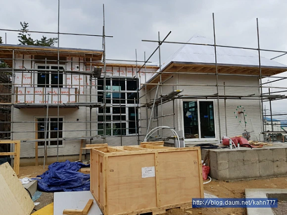 두 개층의 침실동과 여유 있는 천정높이를 가진 거실동을 이어주는 계단홀이 어우러져 리듬감을 만드는 외관으로 구성했다. 설계자가 고민을 많이 한만큼 현장에서 공사의 애로가 많다며 혀를 내두르면서도 공사는 잘 진행되고 있다. 창호공사와 외장재인 세라믹 사이딩 공사가 거의 끝나고 금속재 지붕공사를 일본 기술진이 직접 하게 되는데 일정을 조율하고 있다.
