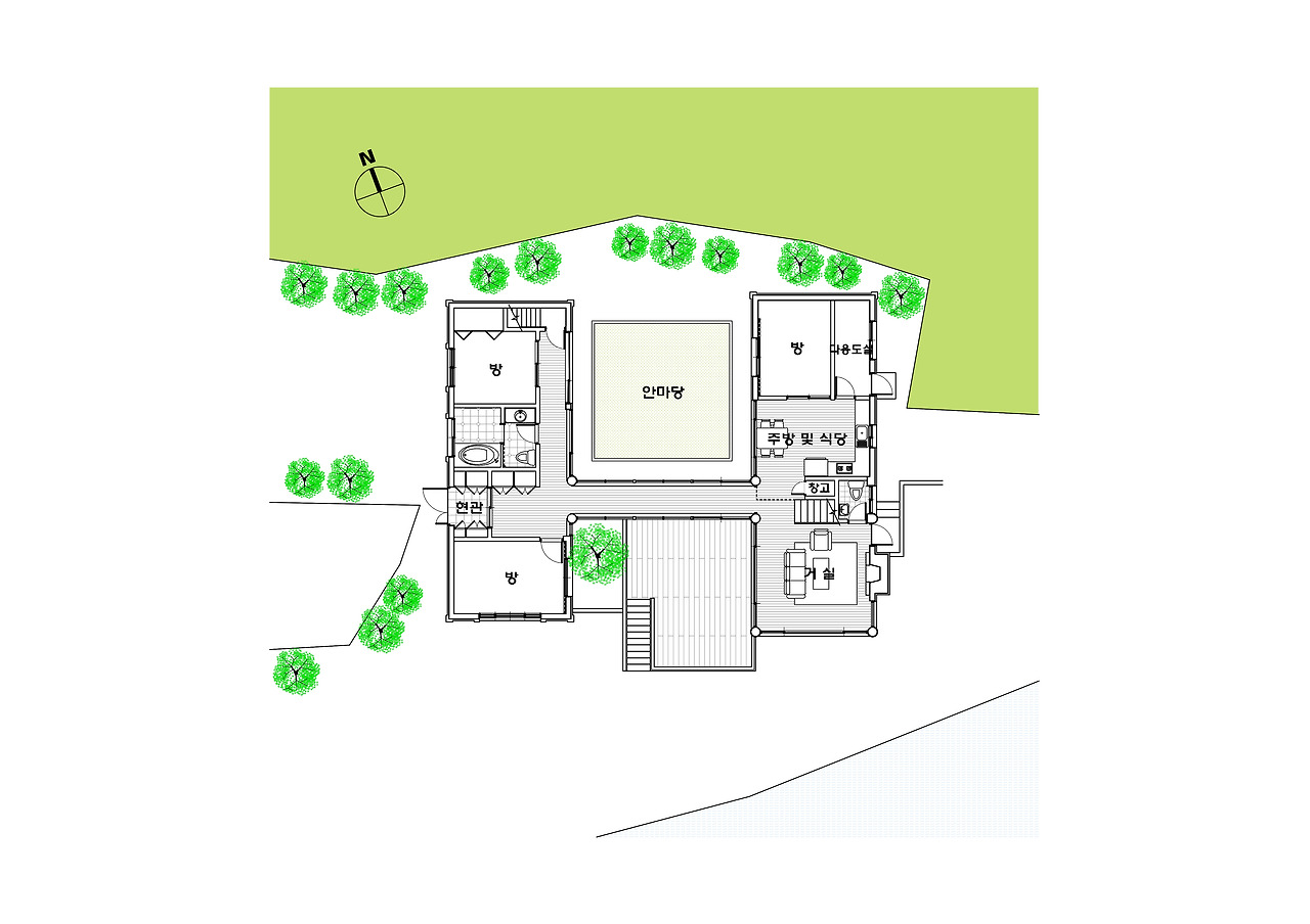 혼자 살아도 두렵지 않고, 손님이 와서 함께 지내도 좋은 분위기에 내정이 큰 역할을 할 것이다. 대지 영역이 넓은 집이어서 이 내정이 없으면 고요함이 지나쳐 고독한 분위기가 되지 않았을까? 내정은 낮에는 존재감이 없다시피 하지만 밤이 되면 빛나는 공간이 된다.