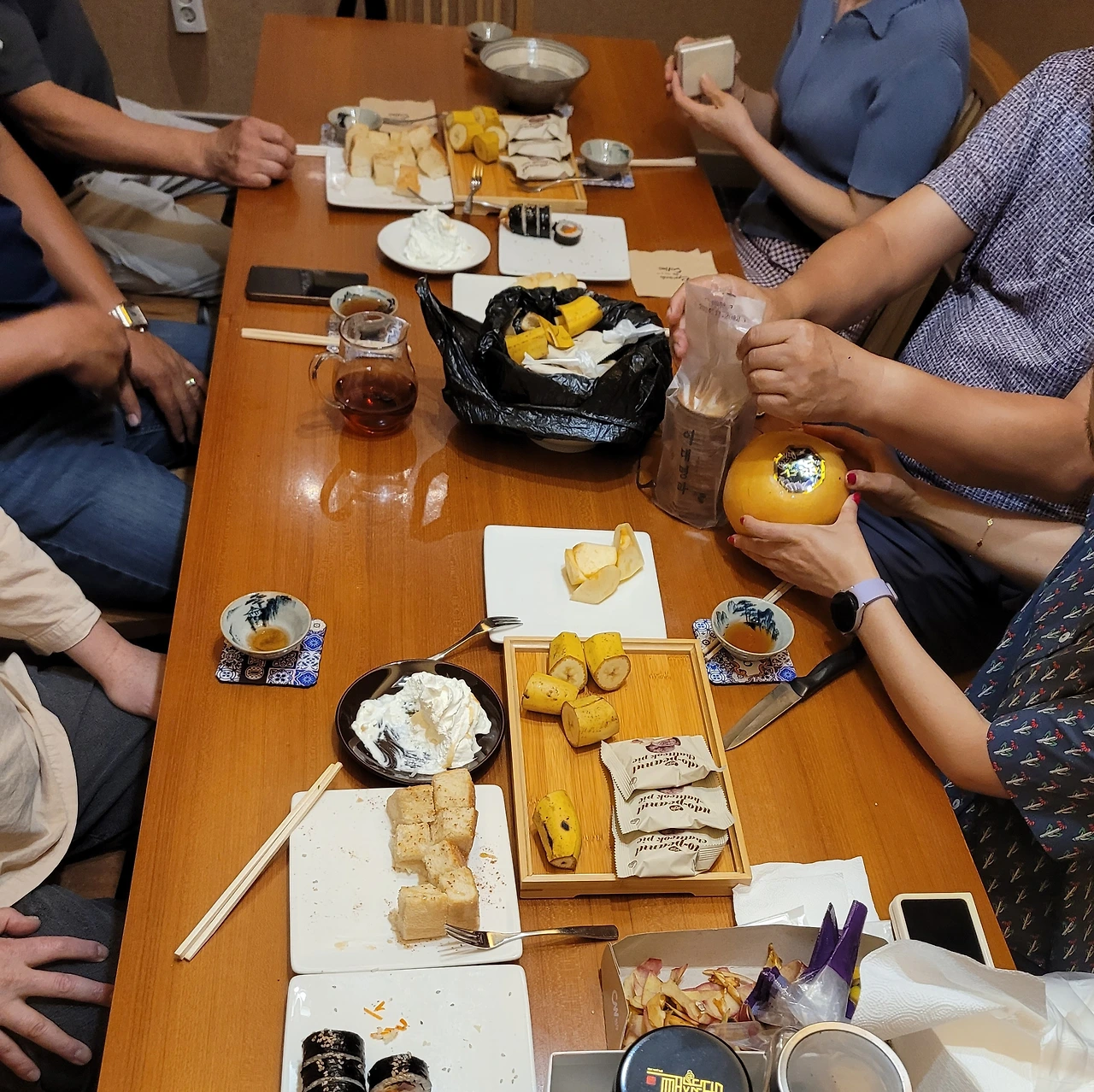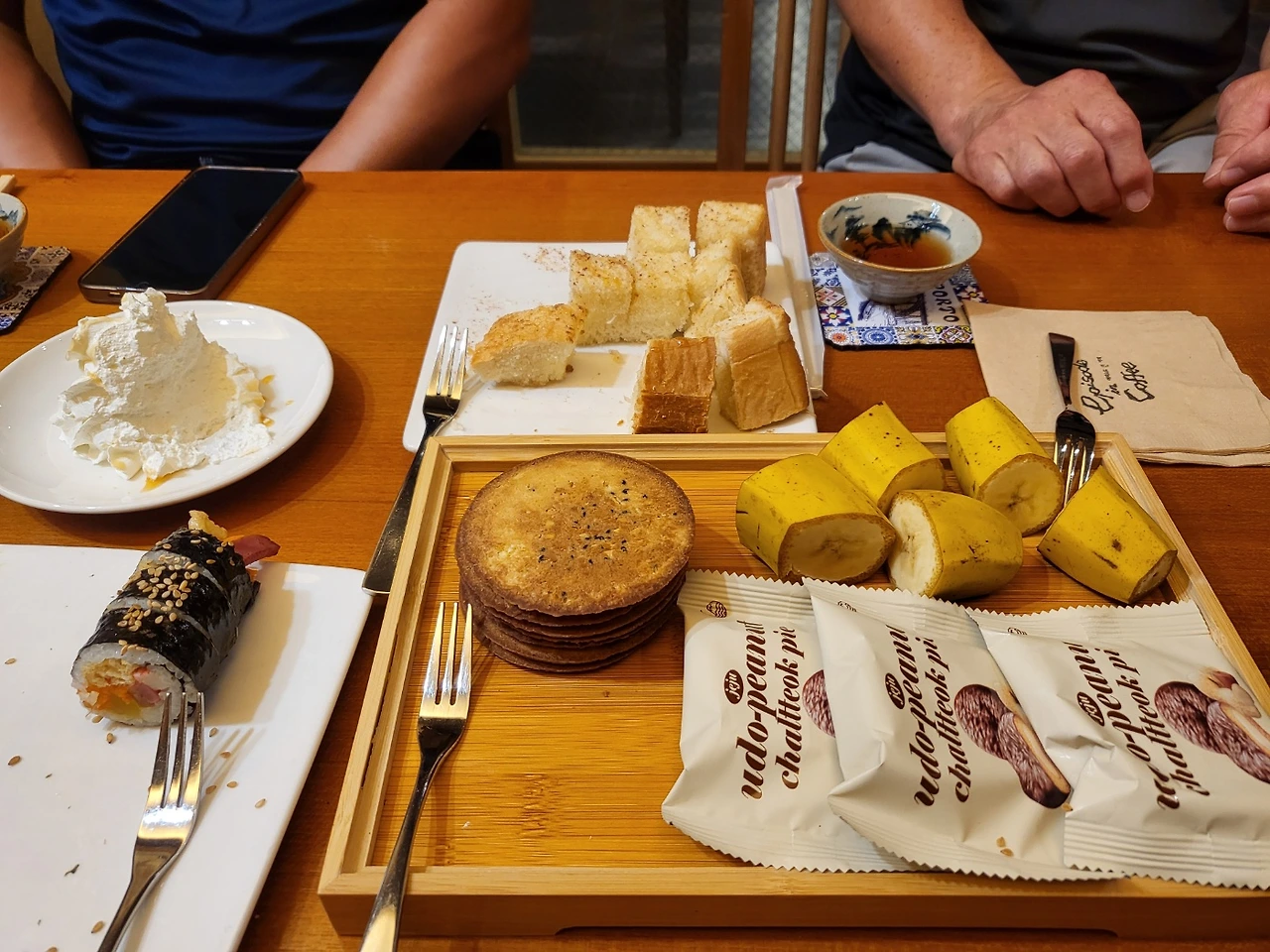 에피소드인커피에서 내놓는 김밥과 허니브레드에다 사과, 배, 바나나, 쿠키까지 먹으며 정담을 나누다 보니 진지한 찻자리는 물 건너갔습니다. 팽주가 홍차 얘기를 끄집어내다가 다시 주워 담아 버렸지요. 맛있는 다식에 숙차와 홍차가 맛을 더해 얘기는 더 달콤해지니 이 흥겨운 분위기를 어떻게 깨뜨릴 수 있을까요?
