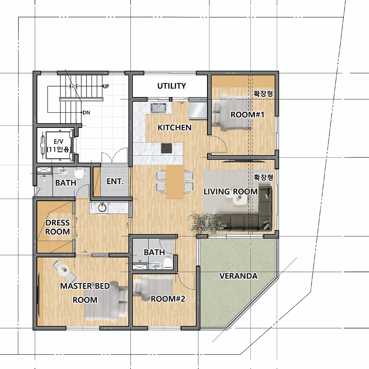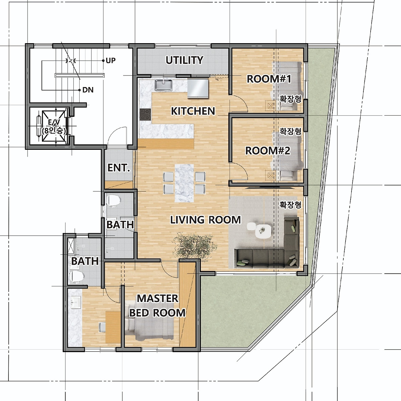대지 형태가 가지고 있는 상황을 보면 남북이 장변이라서 동향집이 된다. 아파트 평면을 생각해보면 가운데 거실과 주방이 있고 계단실이 위치한 북서쪽에 현관과 함께 방이 두 개 놓이게 될 것이다. 남쪽에 면해서 안방과 부속실이 들어가면 크게 이견이 없는 평면이 된다.