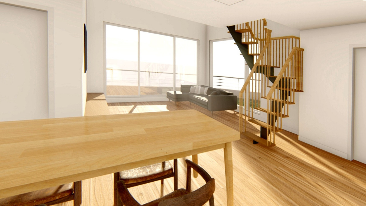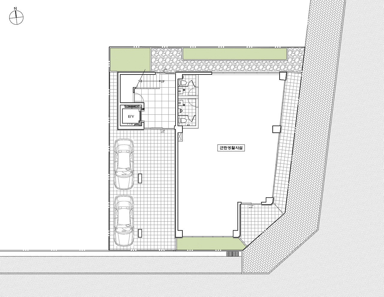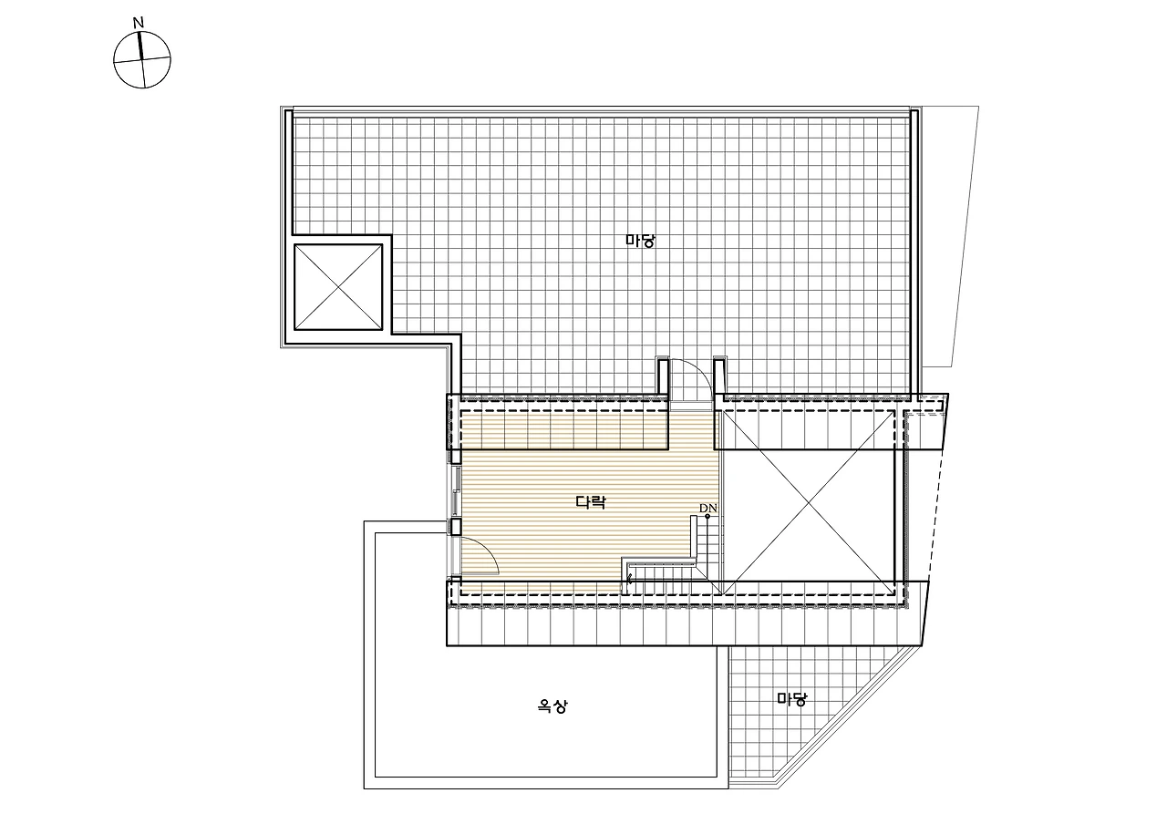 상가주택의 최상층에 들어가는 단독주택의 대지는 아래층 평면의 틀 안이된다. 출입구도 계단실과 E.V가 있는 쪽으로 정해져 있다. 여러 가지 제약 조건이 많지만 아파트만큼 편리하고 단독주택처럼 자유롭게 살 수 있는 집이 되어야 한다.