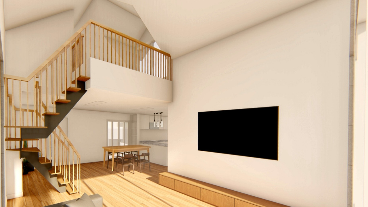 평면도는 도면에서 보는 집의 얼개이다. 실제 지어진 집의 내부는 벽으로 구획되어 있어 전체를 알 수 없다. 결국 집의 분위기를 좌우하는 건 열려 있는 영역인 거실 주방이 될 것이다. 거실은 경사지붕 아래로 깊은 공간이 생기고 다락과 옥상 큰 마당으로 이어지는 계단을 통해 다양한 공간감이 연출된다.