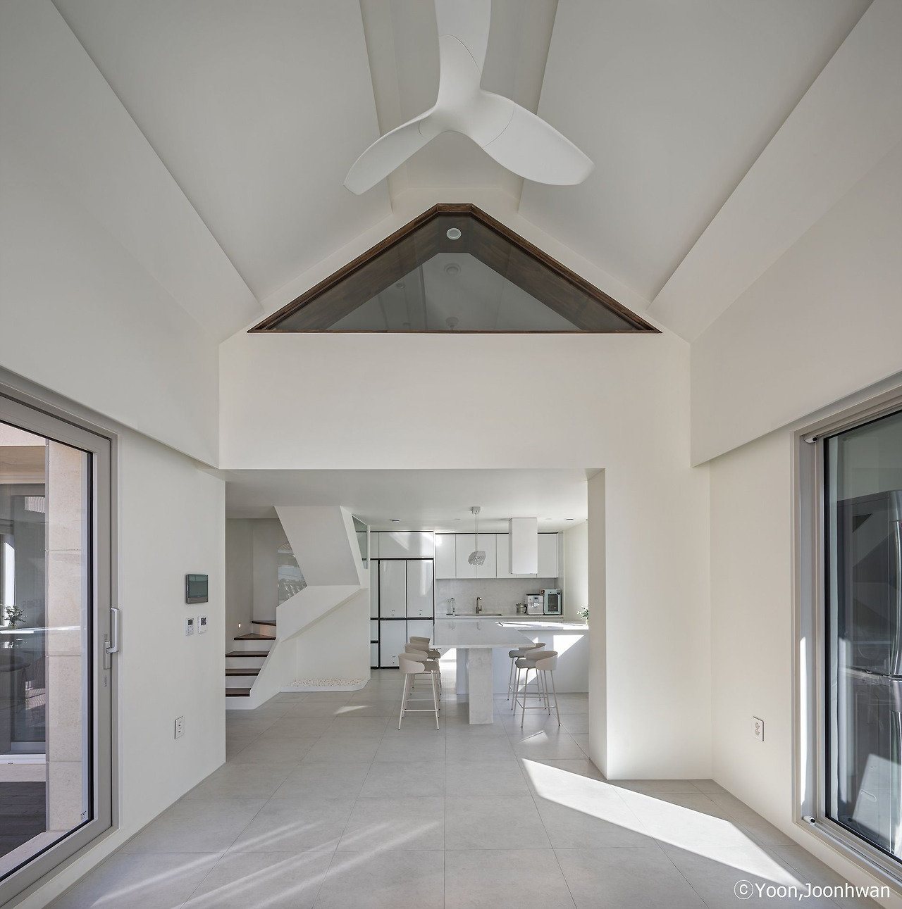 대지의 폭이 가장 넓은 쪽에 거실을 두면서 마당을 넣으니 남향집이 만들어졌다. 작은 마당은 거실 영역과 침실 영역을 분리하는 역할을 하면서 남향의 양명한 햇살을 집안에 들일 수 있게 한다. 아직 초등학생인 아이들은 여름이면 마당에서 물놀이도 할 수 있겠고 휴일이면 고기를 구워 파티도 열 수 있을 것이다. 거실채는 경사지붕으로 실내는 적당한 높이로 공간감을 가지면서 넉넉한 다락을 쓸 수 있게 했다.