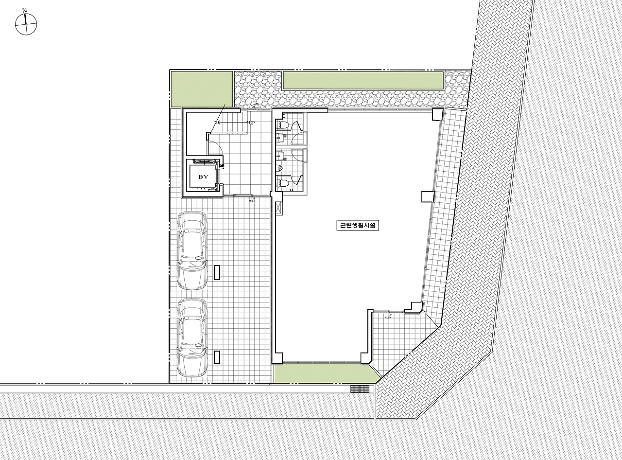 이삼층 출입구는 두 군데가 만들어진다. 보행자는 북쪽으로 통로를 두어 동쪽 도로에서 들어오고 차를 타고 오는 사람은 주차장에 차를 대고 남쪽에서 들어오면 된다. 건폐율에 맞춰서 남은 땅은 북쪽 통로인데 조경 공간이 함께 하게 되니 잘 꾸몄으면 좋겠다.