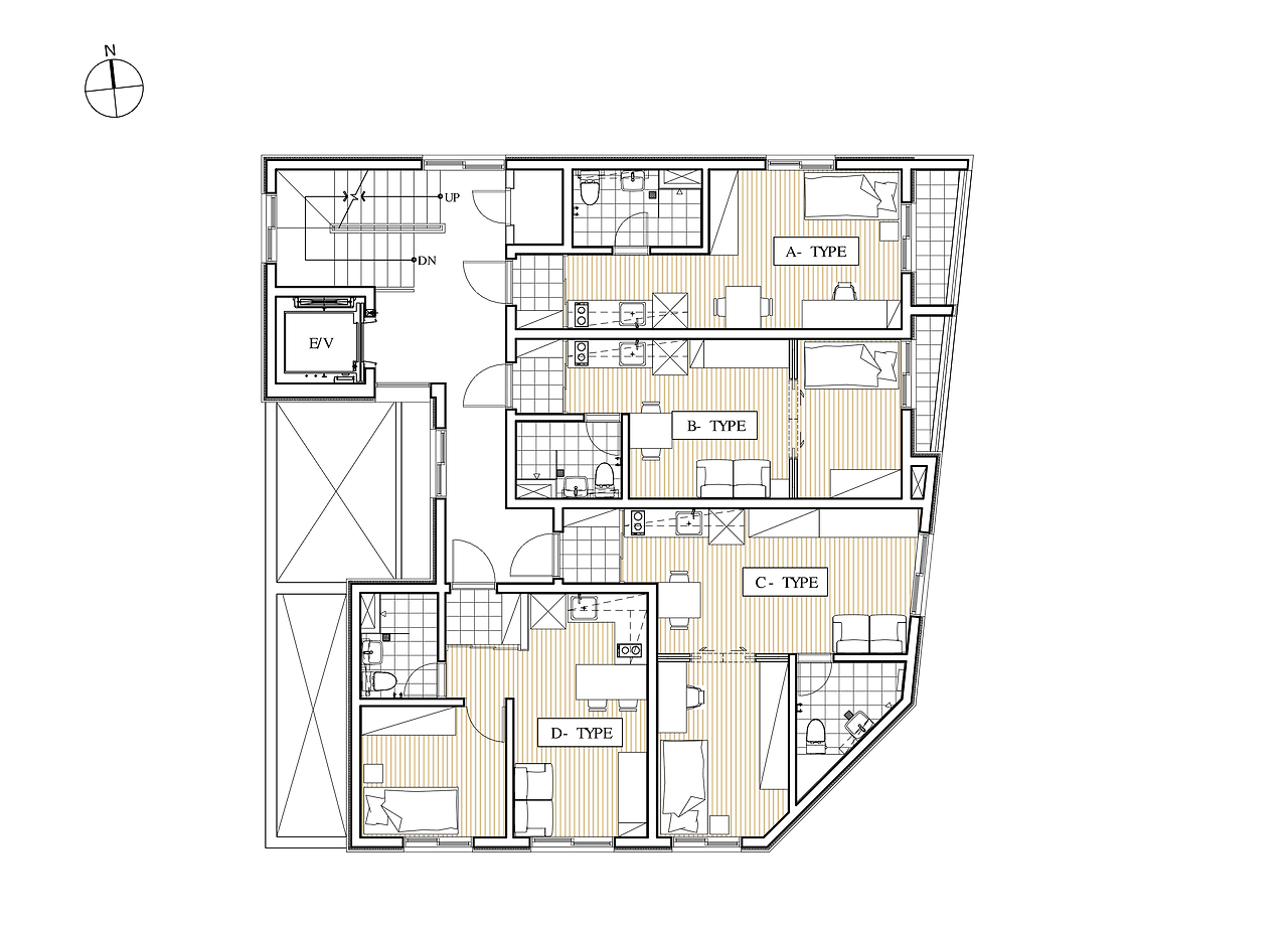 이 세대는 원룸으로 구성되었다. 보일러실을 세대마다 들이려면 좁은 폭의 외벽을 가릴 수밖에 없다. 그래서 네 세대의 보일러를 통합하는 보일러실을 두다 보니 원룸이 되고 말았다. A-type 세대는 발코니를 살려서 공원을 내다볼 수 있는 여건을 가진다.