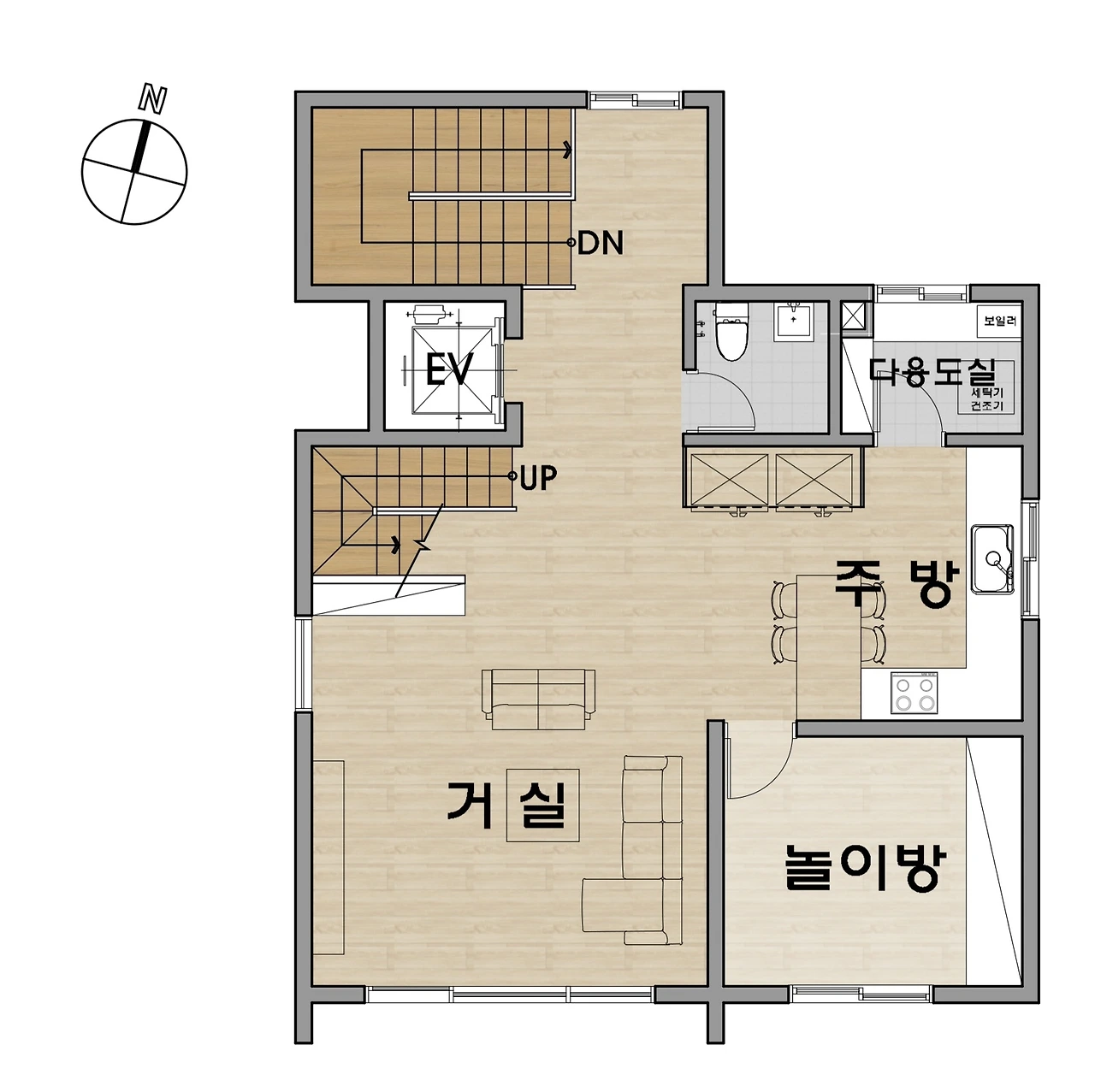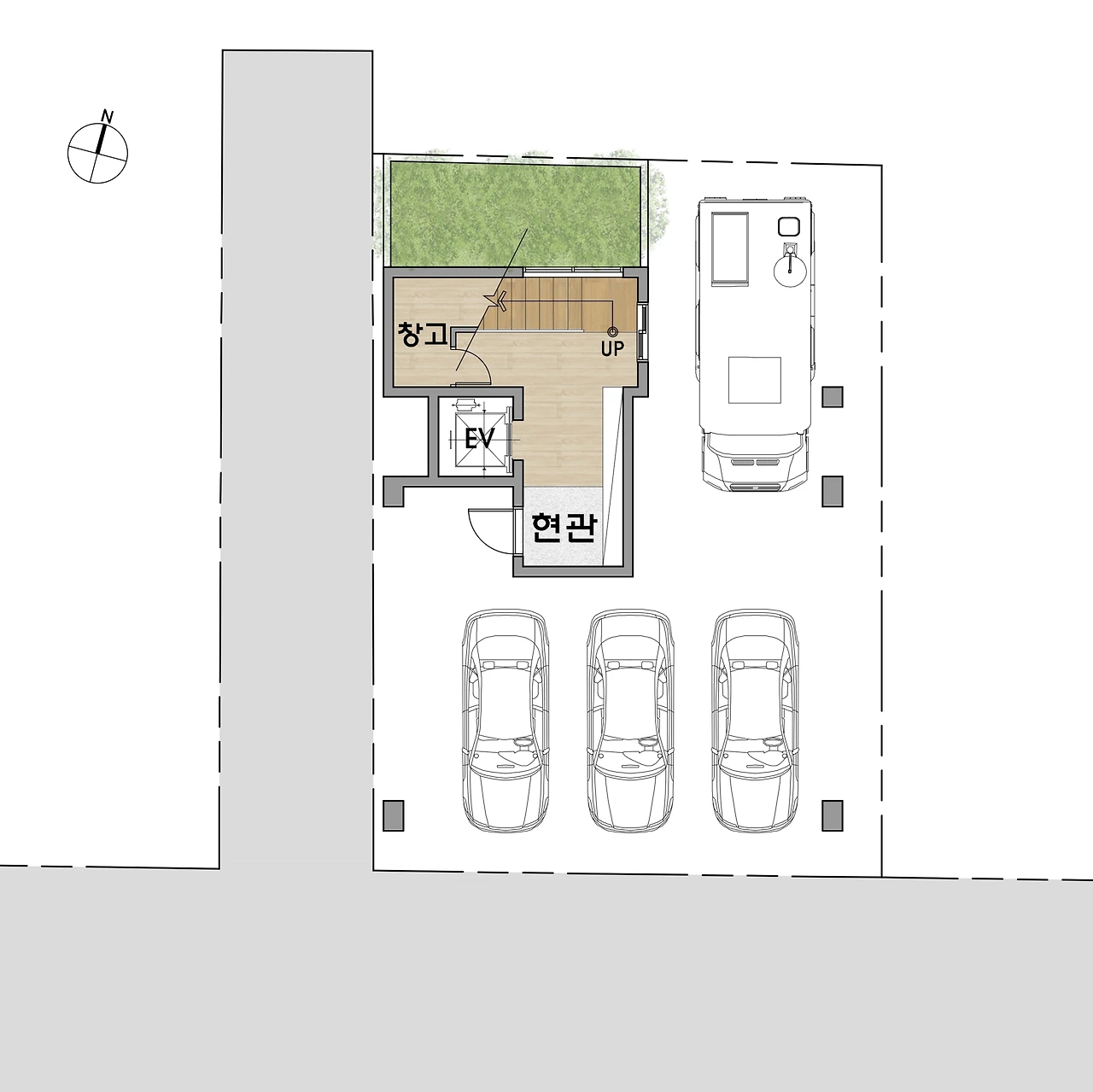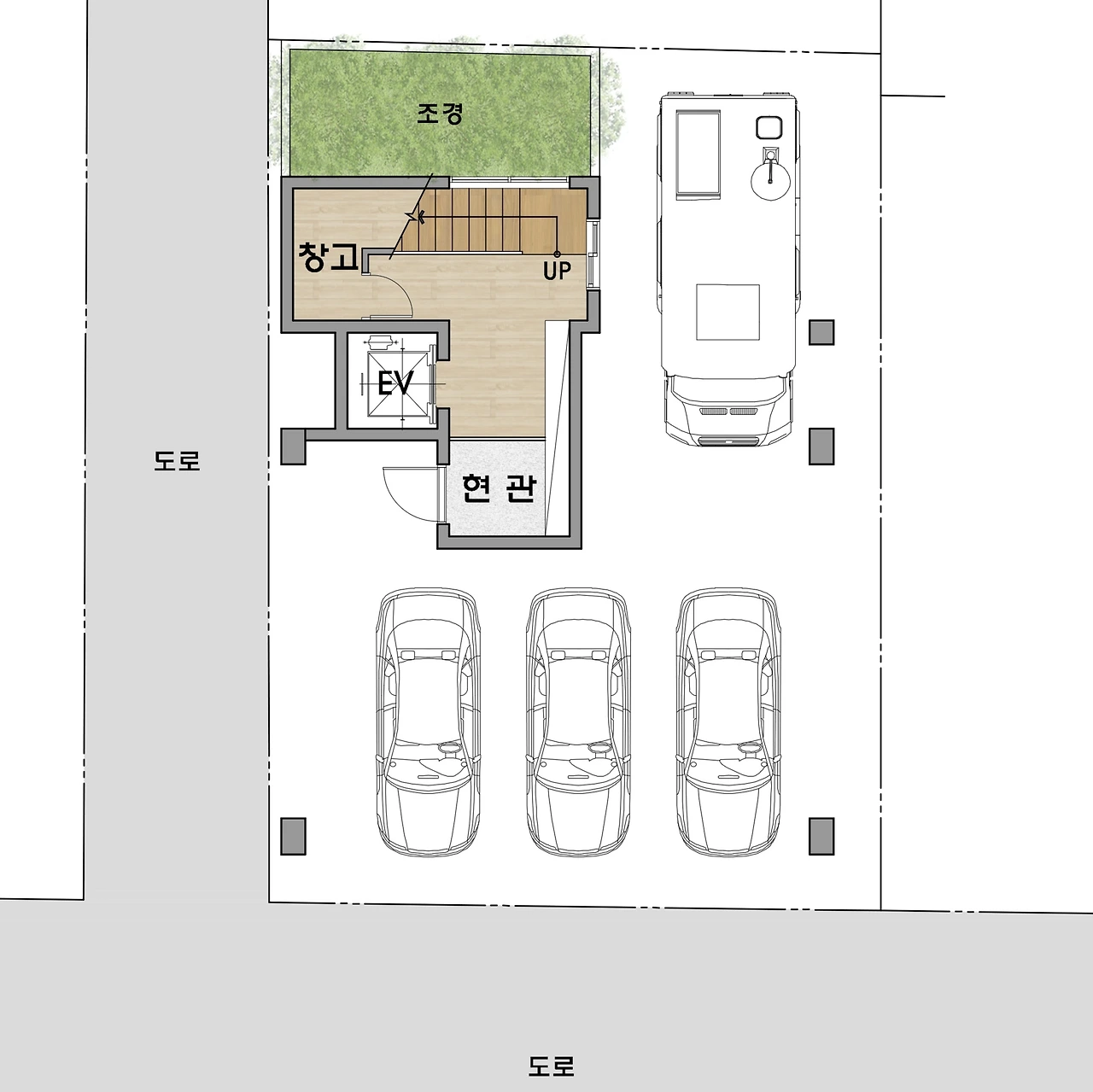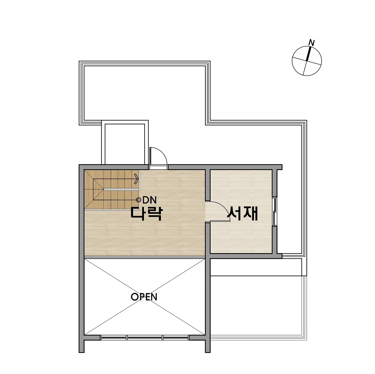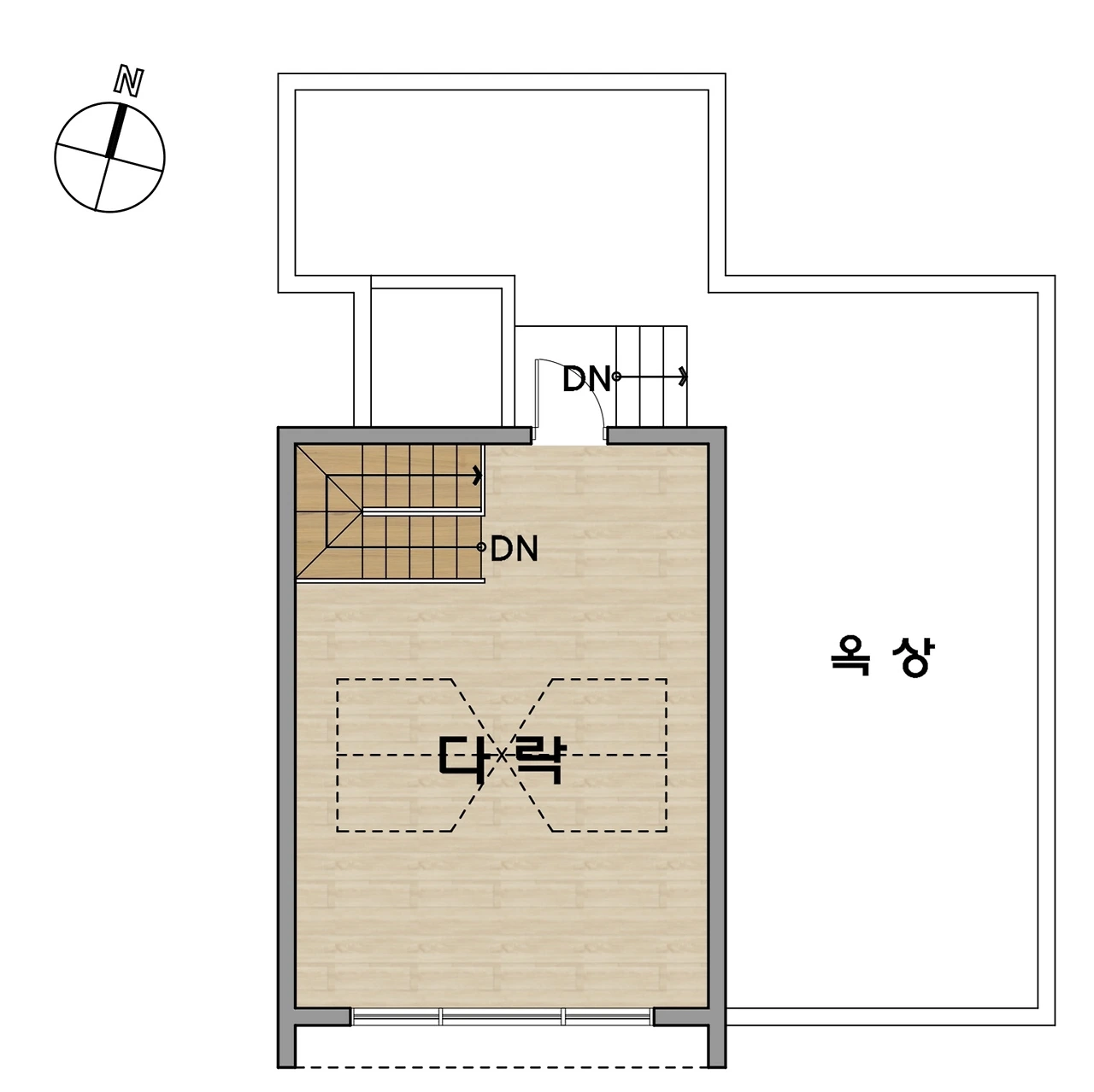 일층에는 현관과 주차장, 이층은 사적 영역으로 침실을 두고 삼층에는 공적 영역으로 거실과 주방, 아이의 놀이방을 두었다. 거실에서 계단으로 다락에 오르면 넉넉한 공간이 있어 수납과 다용도실로 쓸 수 있다. 다락 밖에는 옥상마당이 있어 외부 공간으로 쓰는데 충분하다. 다만 거실에서 다락을 거쳐 마당을 써야 하니 옥상이나 다를 바 없어 제대로 외부 공간을 쓰지 못할 것이다.