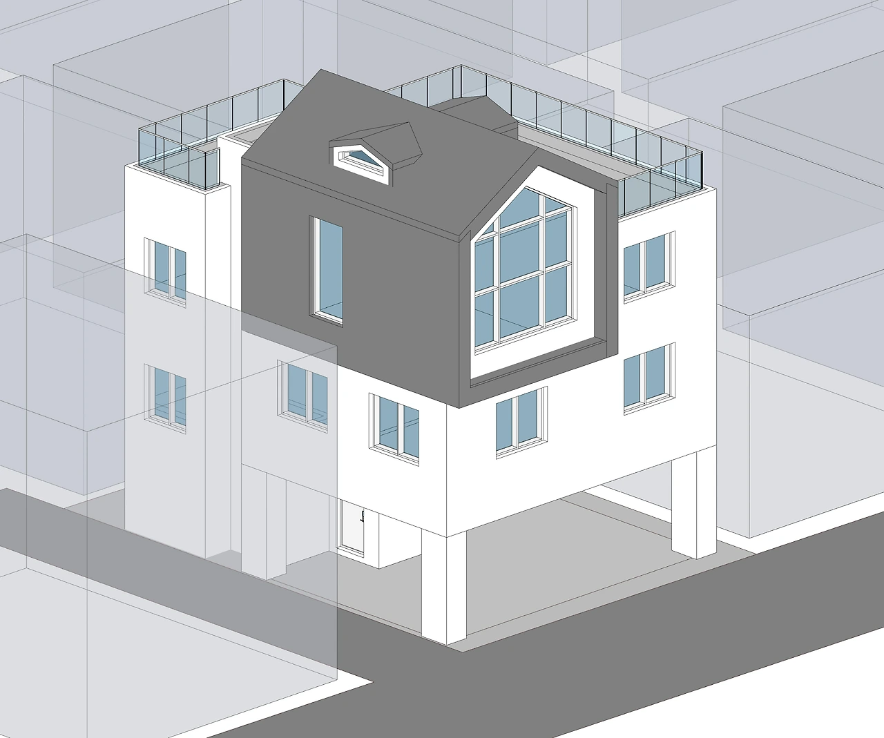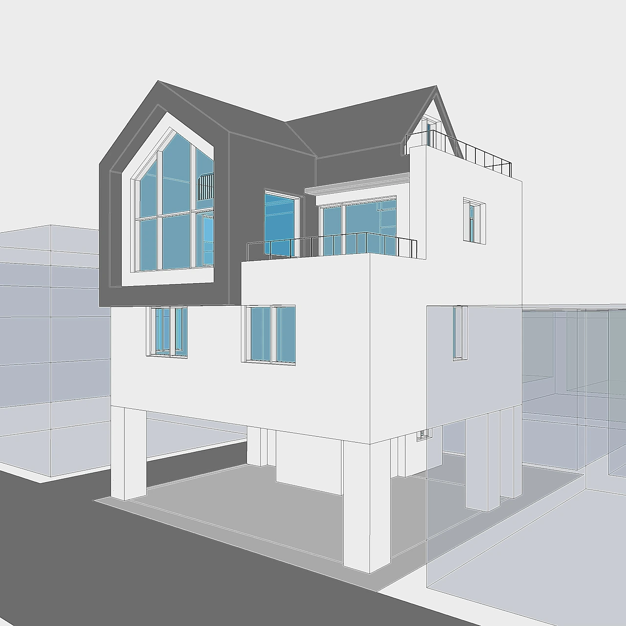 6미터 폭을 가진 도로를 남쪽에 둔 대지는 분명 남향집으로 지을 수 있는 조건으로 볼 수 있다. 그렇지만 도로 건너편에 5층 빌라가 있어 남향 햇살이 대지에 들지 않는다는 걸 파악해야 한다. 동지 기준으로 겨울 햇살을 집에 들이려면 거실 층은 삼층에 두어야 한다. 이 층별 공간 배치는 처음 상담할 때 대지 주변을 분석해서 건축주에게 전해준 바가 있었다. 그때 건축주는 생각해 보지도 않았던 정보를 얻게 되어서 상담하길 잘했다며 부부가 좋아했다고 했다.