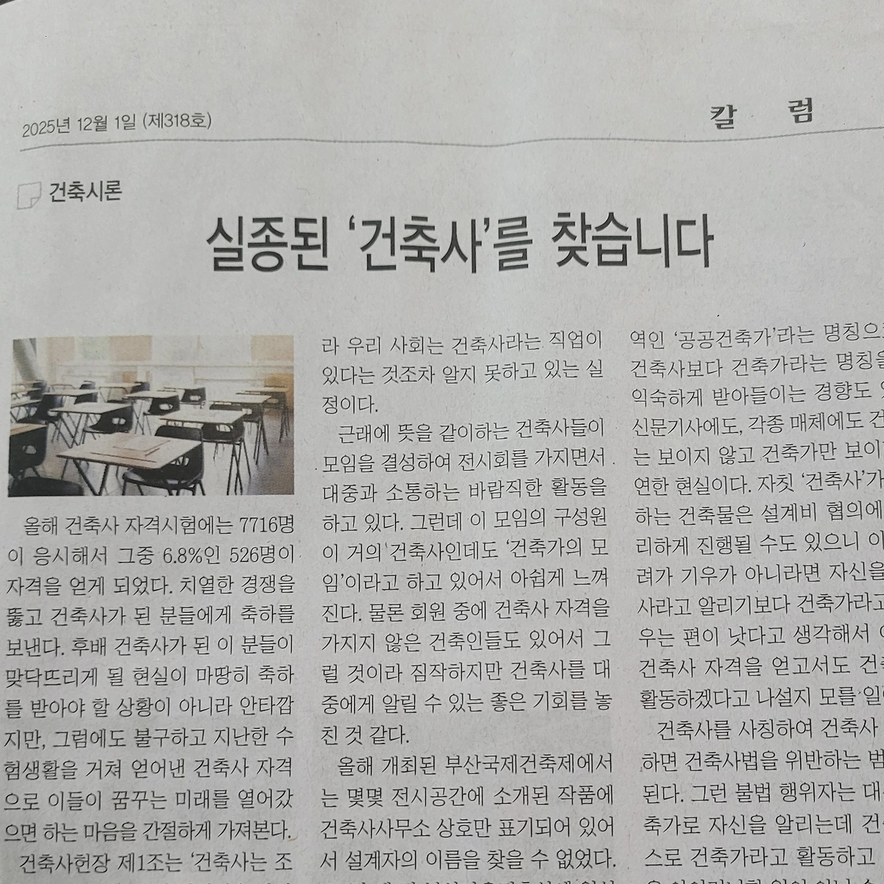 올해 건축사 시험은 7716명이 응시했는데 그중 6.8%인 526명이 건축사 자격을 얻게 되었다. 치열한 경쟁을 뚫고 건축사가 된 분들에게 축하를 보낸다. 하지만 후배 건축사가 된 이 분들이 맞닥뜨리게 될 현실이 과연 축하를 받아야 할 상황이 아닌 게 안타깝다. 그럼에도 불구하고 지난한 수험 생활을 거쳐 얻어낸 건축사 자격으로 이들이 꿈꾸는 미래를 열어갔으면 하는 마음을 간절하게 가져본다.