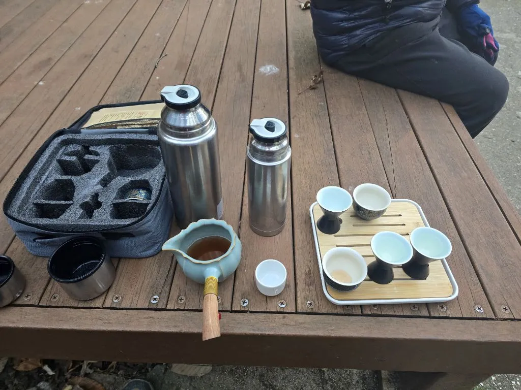 보온병에 담아 온 따뜻한 보이차를 약수터에 온 사람들과 함께 마시며 담소를 나눕니다.