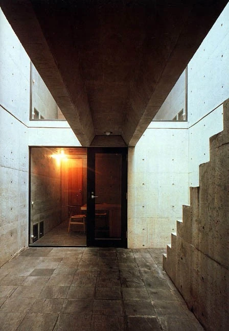 스미요시 주택은 안도 타다오의 출세작이라고 할 수 있다. 좁고 긴 대지의 형태 때문에 인접대지 쪽으로는 창을 내기 어려워서 중정을 두고 실내 채광을 해결했다. 그렇지만 도로에 면한 이층의 방도 창을 내지 않은 건 건축가의 중정에 대한 의도가 강했기 때문일 것이다.