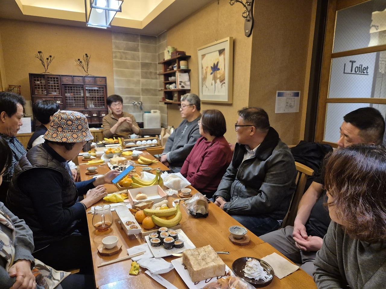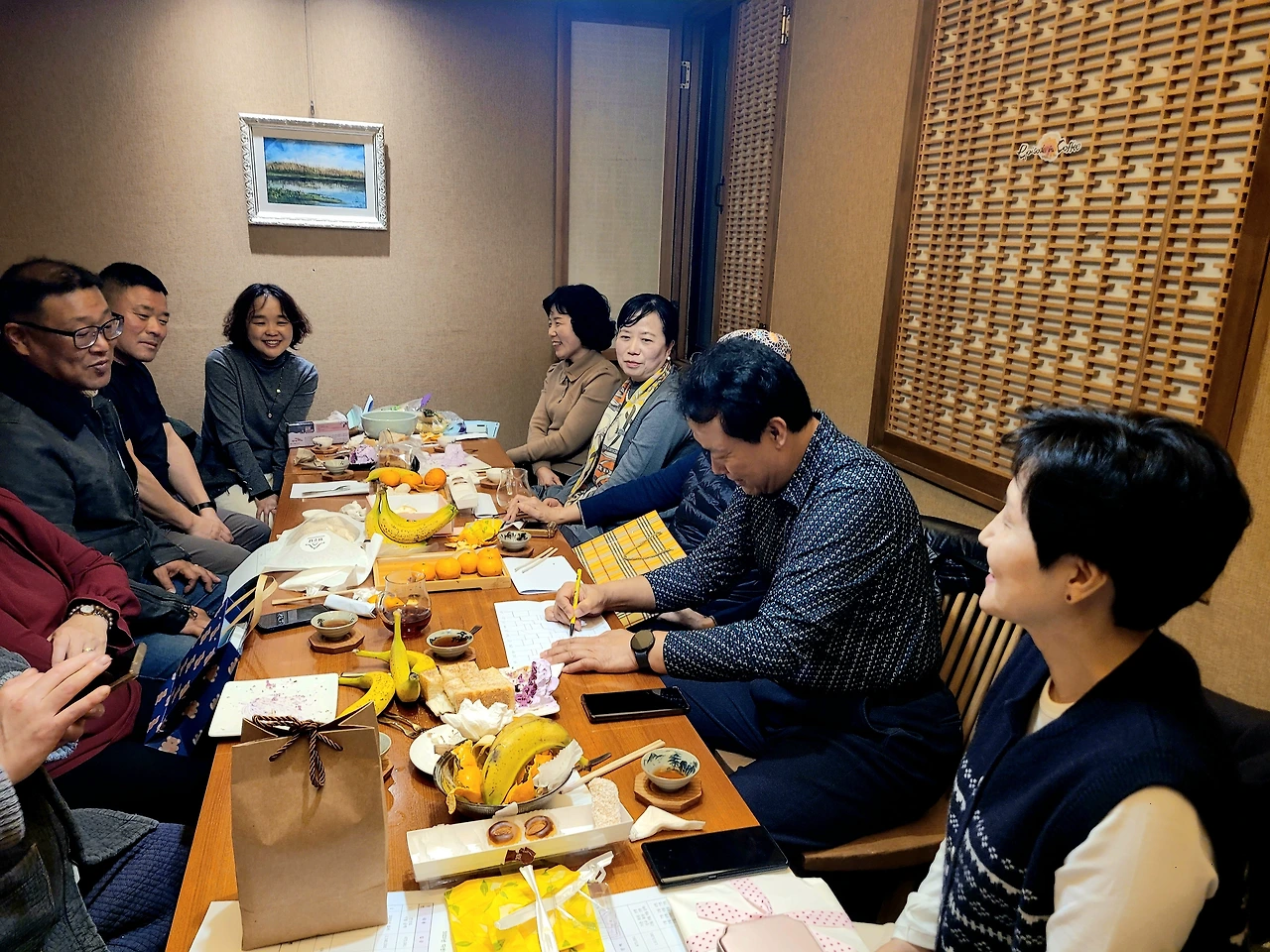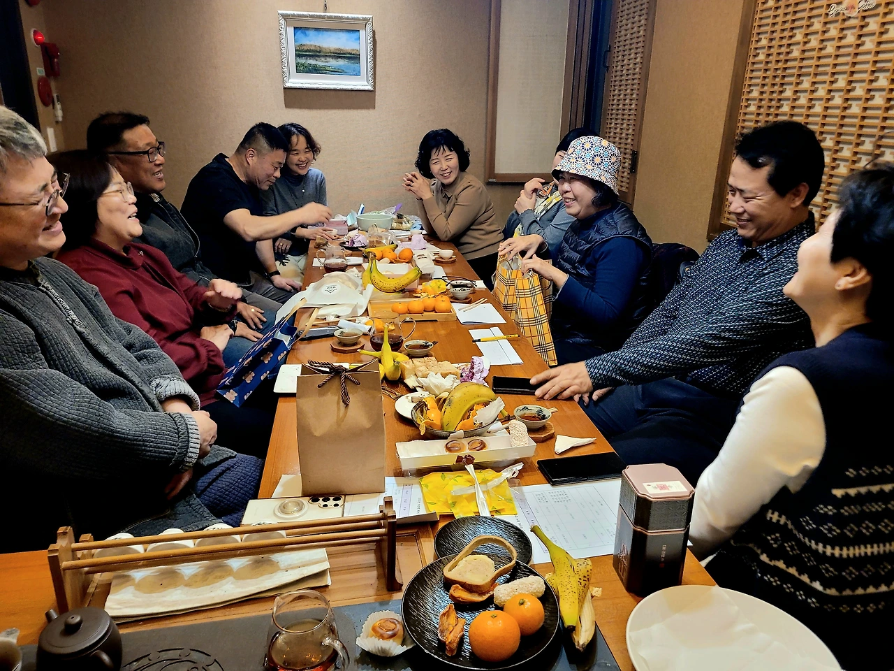 송년 다회라서 그런지 참석 가능 다우 12명 중에 딱 한 분만 참석하지 못하고 다 참석하셨습니다. 남자 다우는 응관님, 상희님, 백룡님, 대명님과 저 무설자, 여자 다우는 서영님, 산수유님, 선영님, 영아님, 은희님, 미란님입니다. 김영님은 음악 모임 연주회가 있어서 못 오고 묵향님은 근무 시간이라 참석하지 못했습니다. 새해에도 이런 열정으로 변함없이 찻자리가 이루어지길 바랍니다.