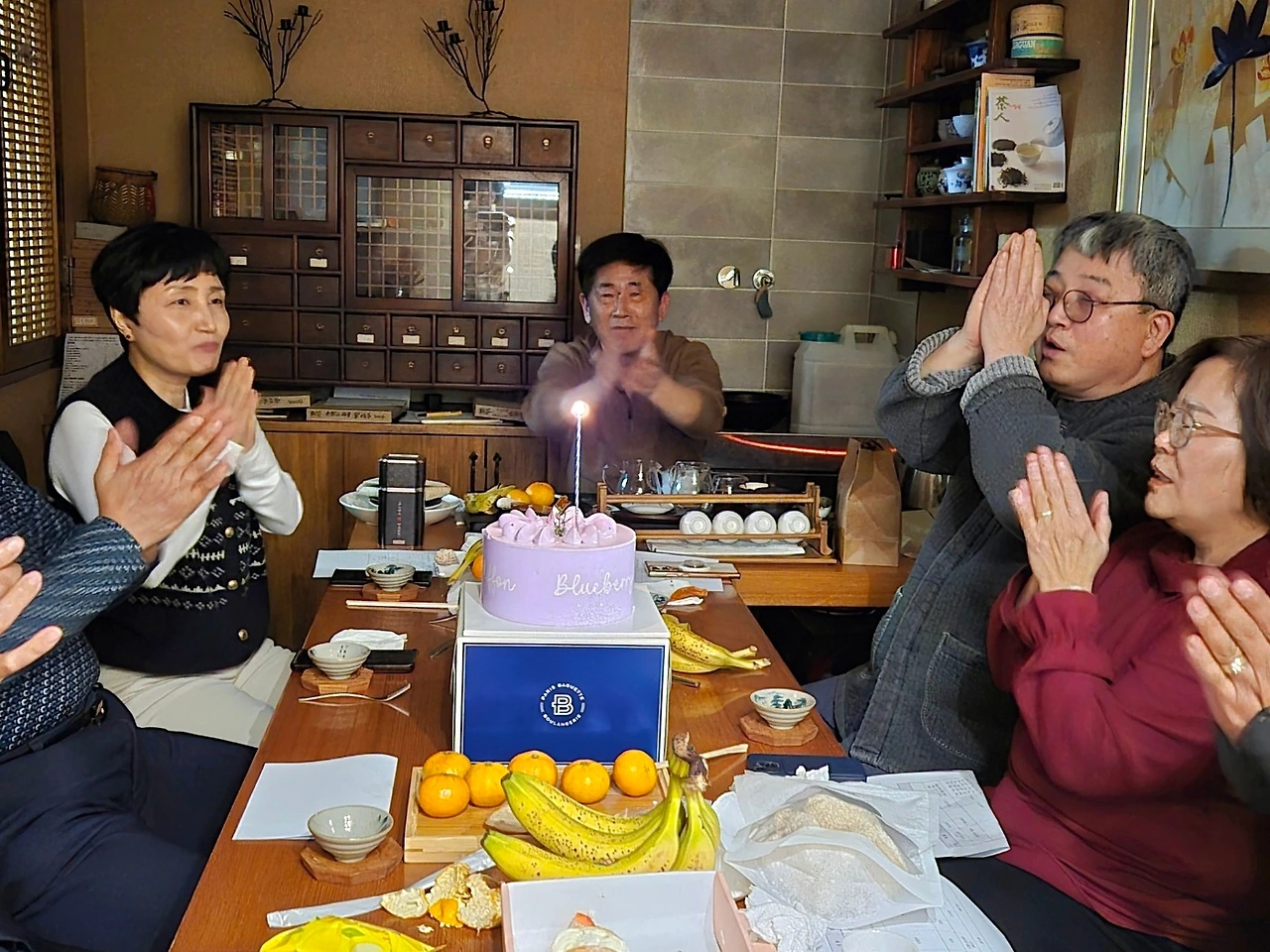 풍성하게 차려진 다식을 먹으면서 다연회와 함께 했던 한 해를 돌아보는 다우들의 개인적인 소회를 들었습니다. 2025년 11월로 다연회가 창립 19주년이어서 한 달 늦게 생일 케이크도 잘랐습니다. 응관님, 묵향님, 서영님은 창립 멤버는 아니지만 15년 넘게 다연회와 함께 다우로 지내오고 있으니 그야말로 차로 인연이 된 귀한 벗들입니다. 영아님, 은희님, 미란님은 근래에 다우가 되었지만 십년지기처럼 편하게 대하게 되니 차는 사람과 사람을 잇는 가교인 것 같습니다.