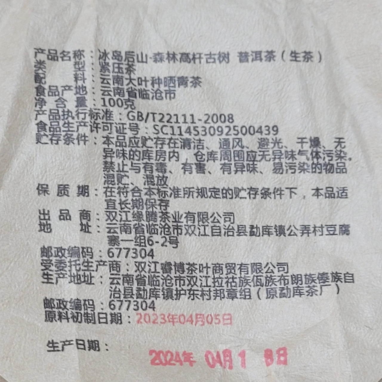 포장지의 뒷면을 보니 빙도후산(氷島后山)-삼림고간고수 보이차라고 적혀 있네요.