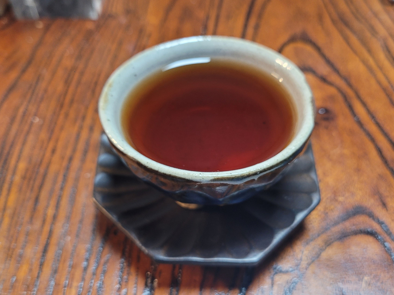 중발효 숙차를 우려서 탕색을 보면 검붉은 색인데 검은색이 많으면 발효 과정에서 과발효된 차입니다. 검은빛이 많은 숙차는 보관 과정에서 탄화(炭化)되었다고 볼 수 있습니다. 싱싱한 돼지 간 색이면 알맞게 발효된 숙차라고 보면 됩니다. 필유여경은 알맞게 만들어진 전형적인 중발효 숙차입니다.