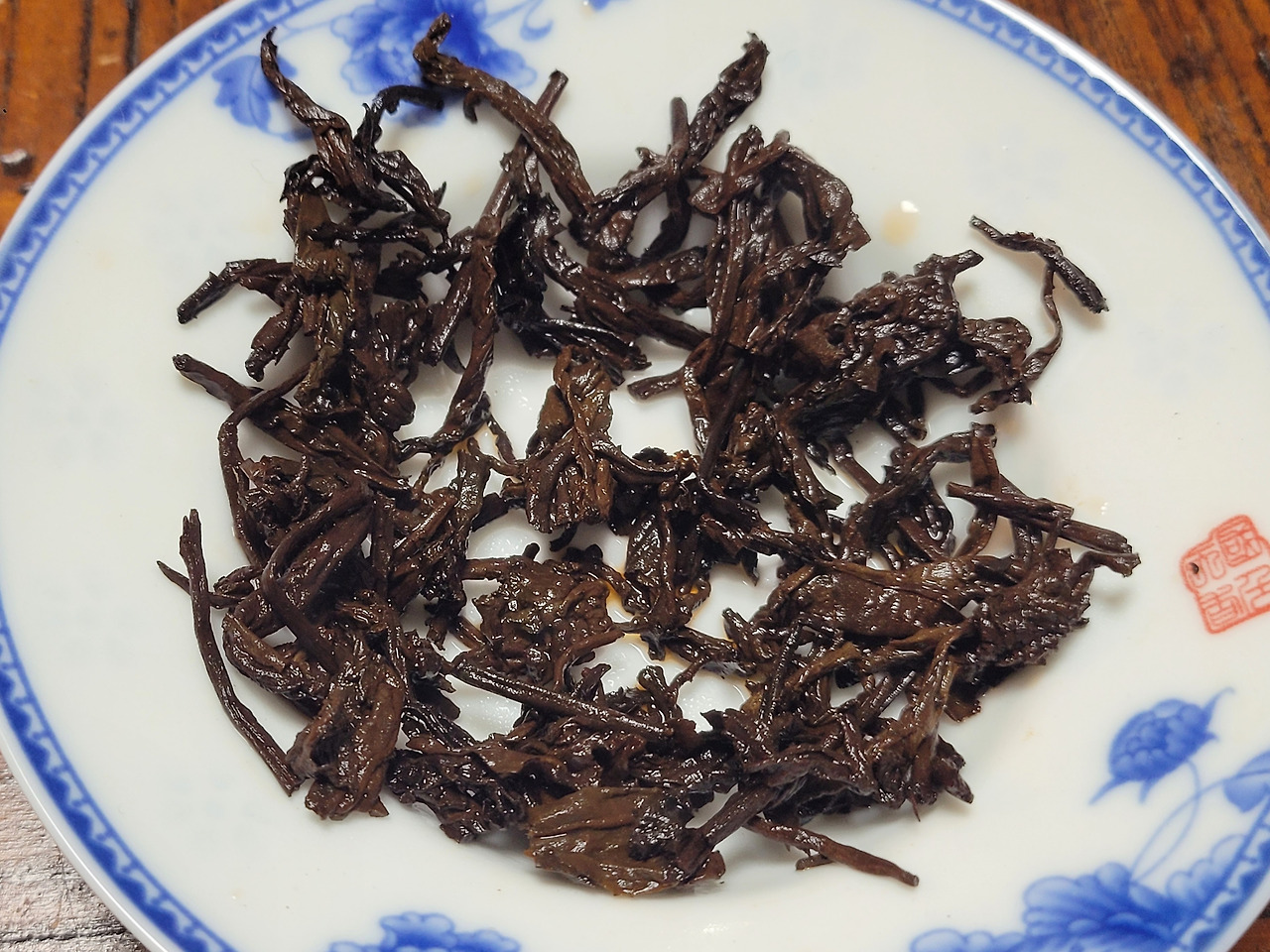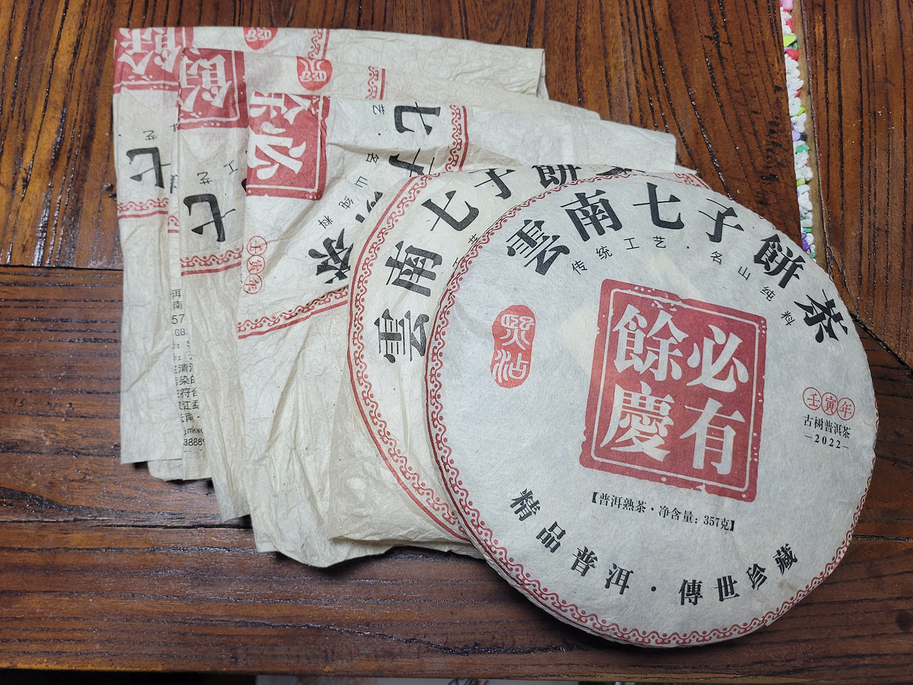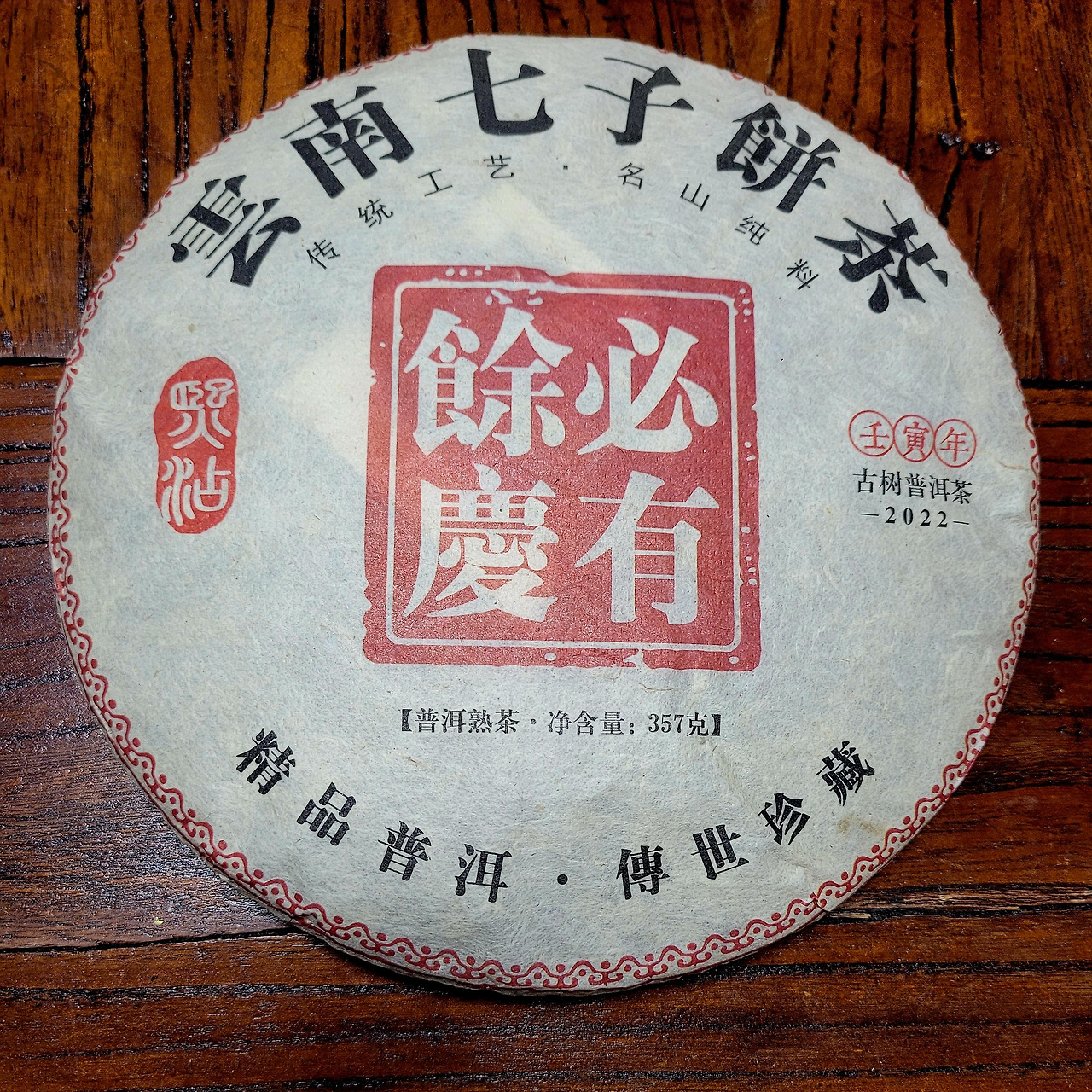 필유여경은 포장지에 고수차(古樹茶)라고 적혀 있는데 관엽형 대지차가 아니라 교목형 차나무 모료를 쓴 고급 숙차입니다. 물론 숙차의 모료는 이름난 산지가 아닐 테고 늦은 봄이나 가을 차로 만들었을 것입니다. 그렇다고 해도 포장지에 산지 이름과 채엽 시기도 표기해 주면 좋겠습니다. 필유여경은 전통 방식의 중발효 숙차라는 걸 차의 병면을 보아도 알 수 있습니다.