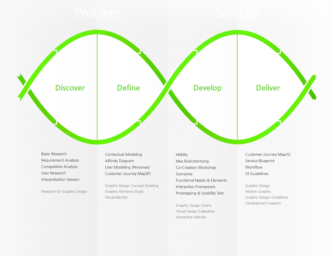 디자이너, 기획자의 업무는 회사 by 회사이기 때문에 이 글에서 섣부르게 '디자이너라서 이런 일을 한다.' '기획자라서 이런 일을 한다.' 이렇게 구분 짓긴 어렵다. 짧은 나의 직업 경험상 더블 다이아몬드 단계로 예시를 들면 디자이너일 때는 Discover > Define > Develop 단계를, 기획자일 때는 Discover // Deliver 단계를 주로 하고 있다.