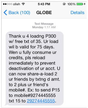 GLOBE의 문자 메시지를 보면 영어 사용 국가 로컬들이 사용한다는 영문 줄임체가 떠올랐다. 주로 사람들에게 일괄적으로 보내는 이 안내 문자 메시지는 이 USIM의 종류, 유효기간, 재사용 방법 등을 안내하고 있다. 정보 전달이 우선인 이 문자 메시지에서 굳이 줄임체를 사용한 이유가 있을 것이다. 필리핀 사람들은 영어 줄임말을 사용하는 게 일상화되어있거나, 한 번에 보내는 메시지 수가 매우 한정적이거나..