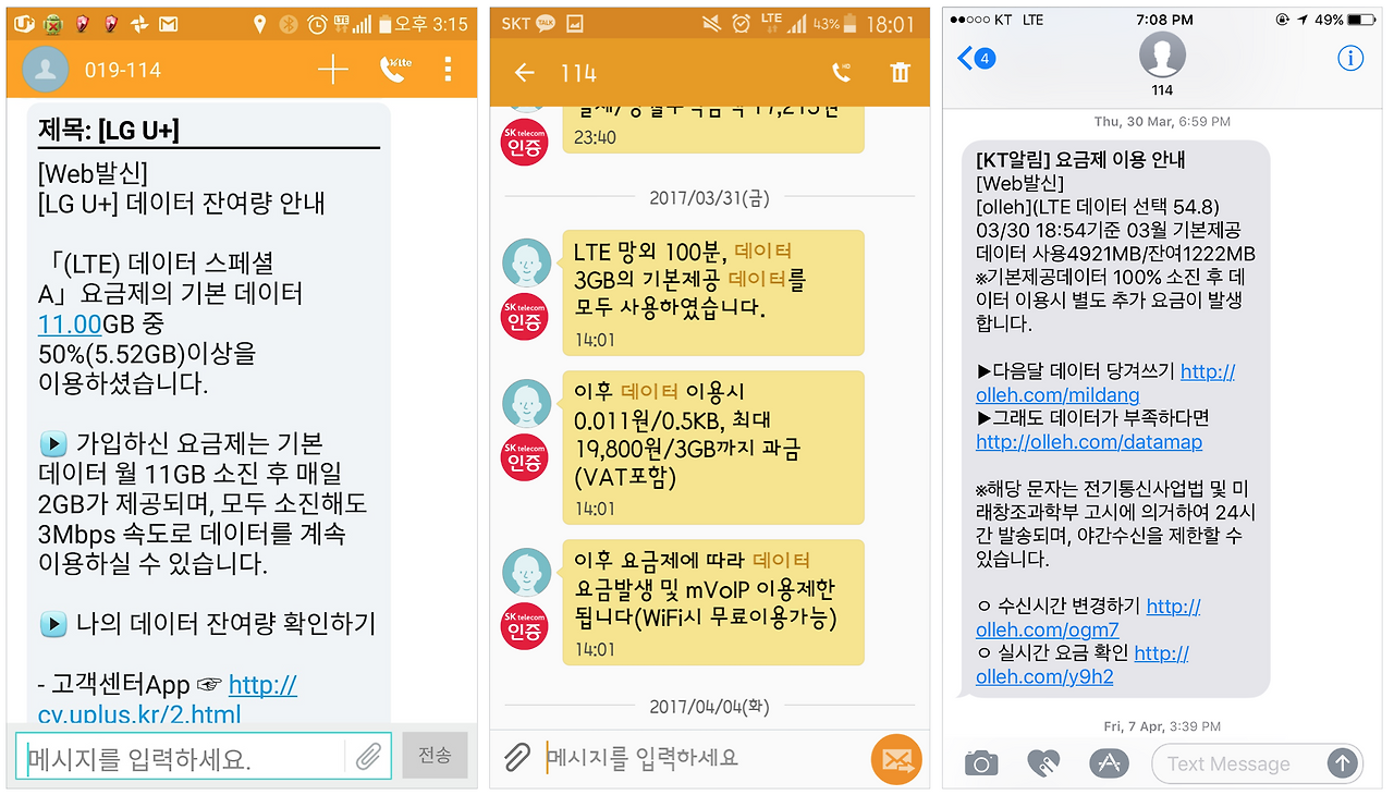 국내 사례를 모으면서 통신사별로 특색을 찾을 수 있을 만큼 각 통신사 별로 문자 메시지의 어조가 크게 다르지 않을 것이란 생각이 계속 들었다. 그런데 동일한 정보를 제공하는 문자 메시지를 나열해보니 제법 다른 부분을 찾을 수 있었다. 아래는 통신사 별로 '데이터 잔여량'을 알려주는 문자 메시지이다.