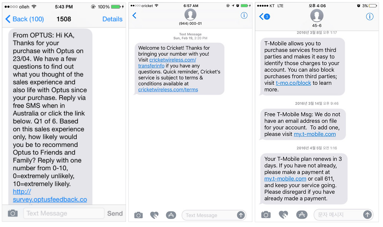 물론, NN Group처럼 실제로 리서치를 통해 각 통신사별 문자 메시지를 비교한 것이 아니기 때문에, 해당 문자 메시지가 적절하게 쓰였는지 판단할 수 없다. 또한 영어를 네이티브처럼 하는 게 아니어서 영어가 주는 어조를 정확하게 느낄 수 없다. 영어를 사용하는 국가별로 문자 메시지를 수집하면서 우리나라 통신사의 문자 메시지는 어떤지 궁금해졌다.