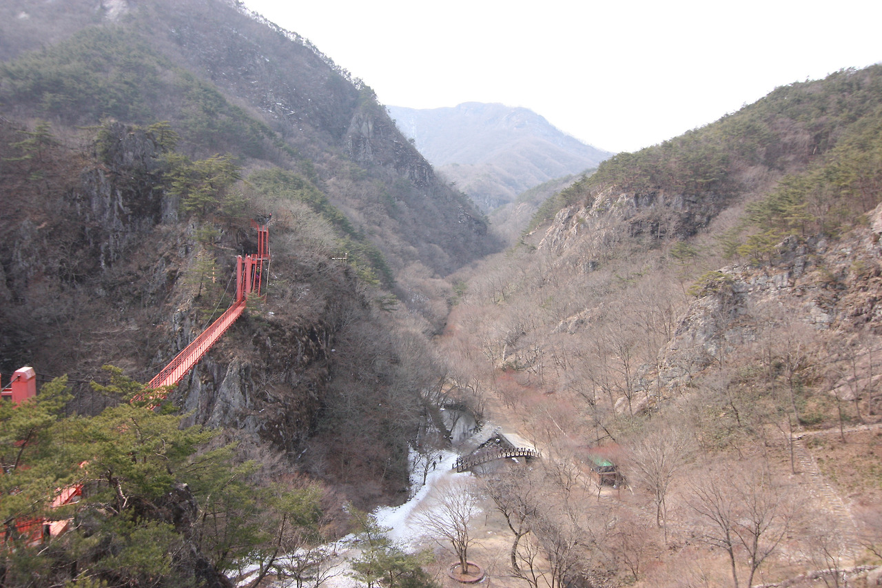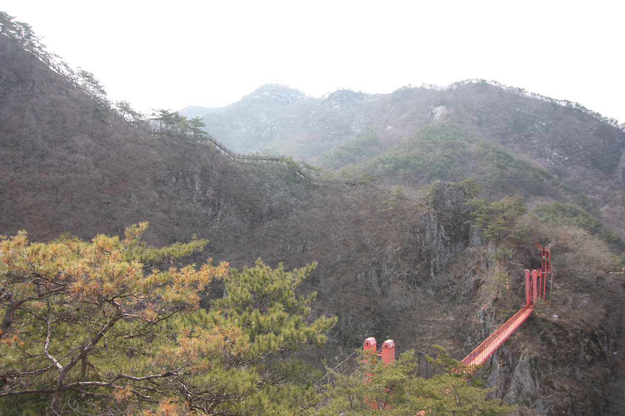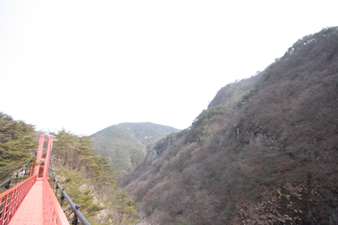 여러 산 봉우리들 사이를 거닐다가 위로 올라오면서 보이는 것은 이 곳이 꽤나 산세 안 쪽에 위치한 다는 점이었다. 주위를 둘러보면 보이는 여러 봉우리들은 강천산이 그리 작은 산이 아니라는 점, 그리고 우리가 건너려는 구름다리가 그 산 봉우리와 봉우리를 잇는 다리라는 점이었다. 비록 구름다리 자체는 조금 흔들리는 정도라 위험하지는 않았고 다리 자체의 미관이 우리가 흔히 생각하는 화려한 금문교와 같은 모습이나 사극에서나 볼 것 같은 나무와 굵은 밧줄로 연결된 위험천만한 낡은 다리가 아닌 자칫 밋밋할 수 있는 빨간 철교였지만, 그 위에서 바라본 풍경만은 전혀 밋밋하지 않고 오히려 이 작은 산에서 볼 것이라고 생각지도 않았던 멋들어진 풍경이었다.