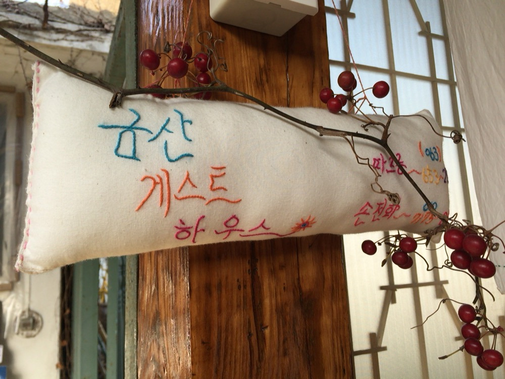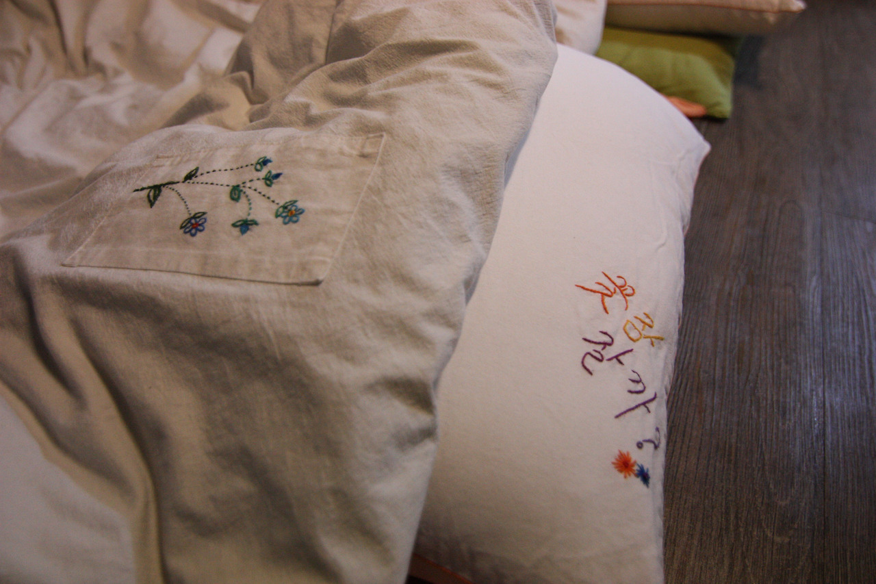 배게와 이불에는 직접 수가 놓여있었고, 방안의 소품들은 정말로 아기자기함 그 자체였다. 특히, 저 꽃잠이라는 단어가 가져다주는 귀여움은 보자마자 소리를 지를 수밖에 없게 만들었다. 물론, 저 거울이 한 번 굴러 떨어지는 대형 참사가 벌어지기는 하였으나 천만다행스럽게도 깨지거나 하지는 않았다.