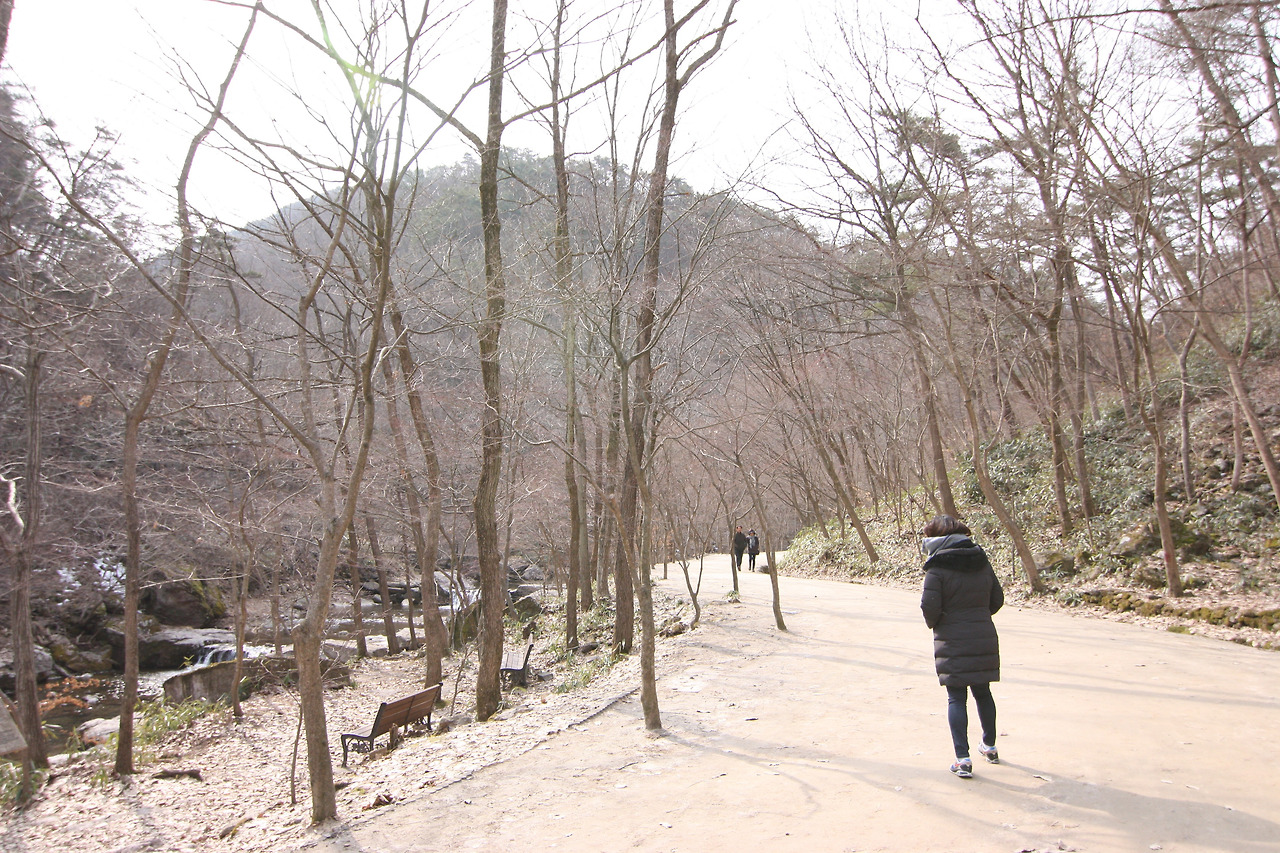 입장료를 내고 강천산 군립공원으로 들어가면 평평한 흙길이 펼쳐진다. 여름에는 사람들이 맨발로 다니면서 건강 걷기 같은 것도 하는 곳이다 보니 별다른 시설물이 없는 흙길이다. 지난 비와 눈으로 바닥이 조금은 진흙이 되어있었지만 나중에 날 따뜻할 때 맨발로 걷는 것도 나쁘지 않을 것 같은 느낌이었다.