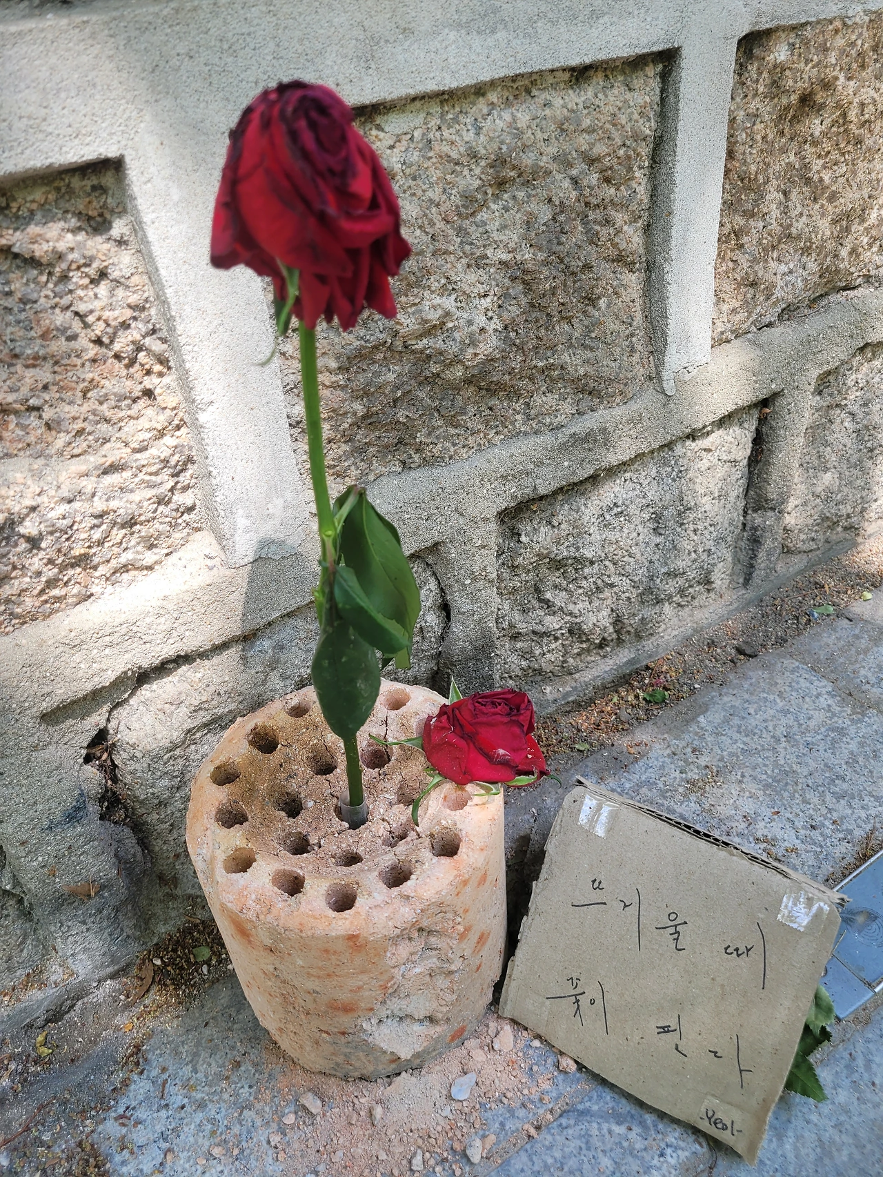 다 타 버린 연탄재에 꽂혀 있는 빨간 장미 두 송이. 그리고 그 옆에 종이 박스를 부욱 찢어 만든 듯 보이는 작은 팻말이 놓여 있었다. 그 종이 팻말에는 춤 추는 것 같은 필체로 이렇게 쓰여 있었다.