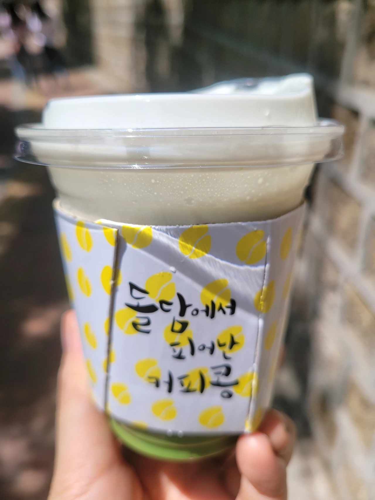 낙지볶음으로 점심을 잘 먹고 나서 바로 옆에 있는 '돌담콩'이라는 카페에서 음료를 테이크아웃했다. '돌담콩'은 '돌담에서 피어난 커피콩'의 줄임말이었다. 카페 주인은 어쩌면 이렇게 돌담의 감성을 제대로 살린 이름을 지었을까? 순전히 그 이름에 반해서 들어간 카페였다.