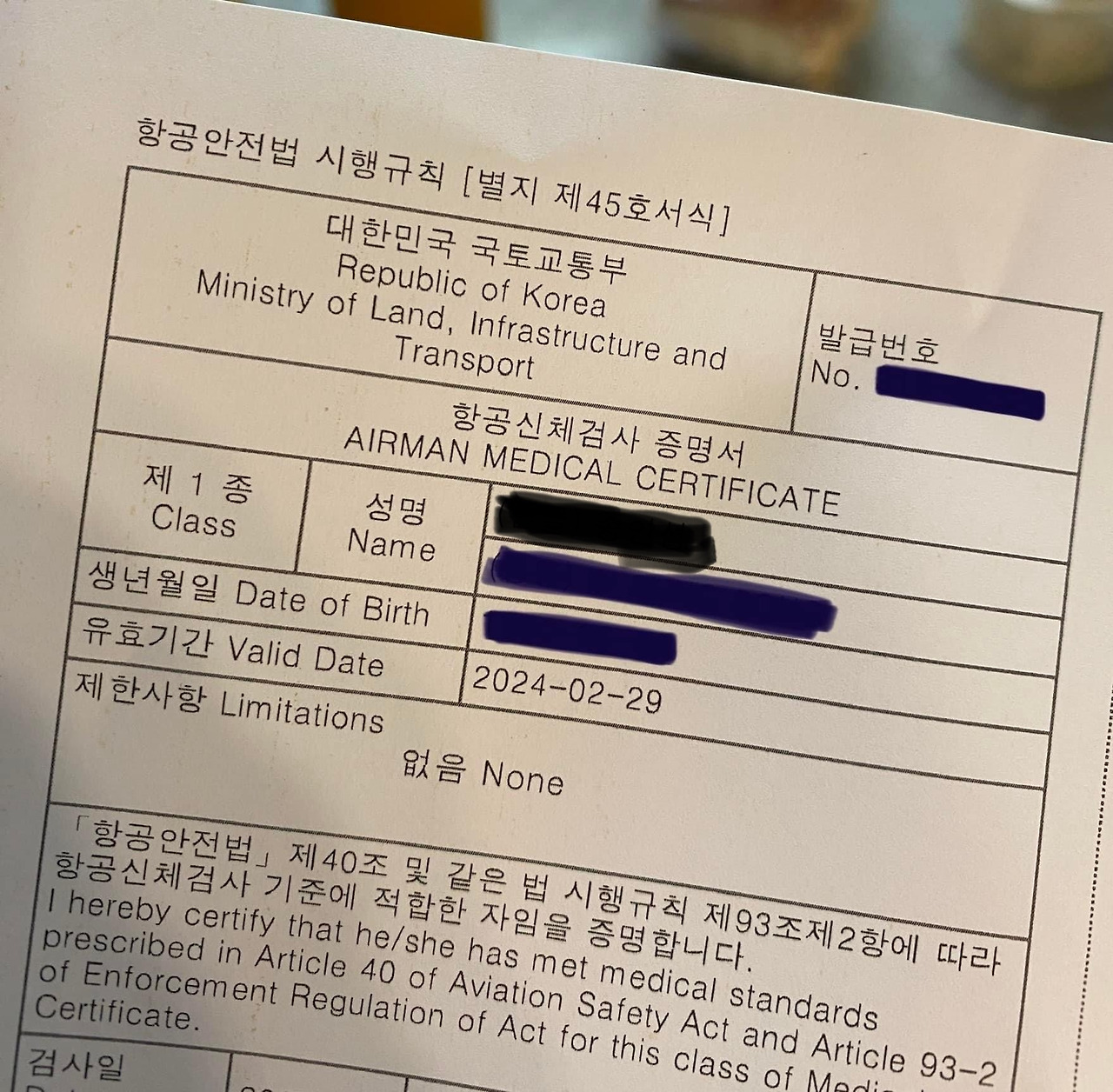 ref. 1종~3종 신체검사 중 항공사 조종사는 1종 신체검사를 받고 1년간 유효기간을 유지한다.