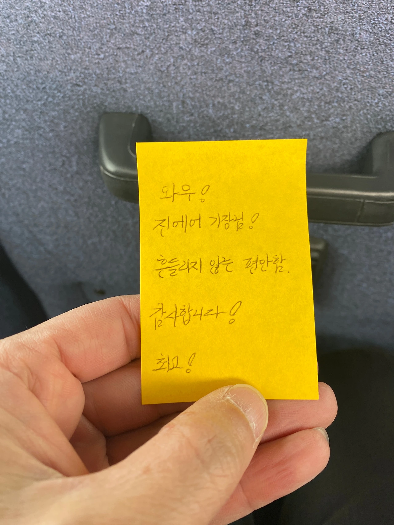“기장님~ 승객분들 다 내리시고, LB랑 잔류 승객 없으신지 확인하는데, OO 열 의자 뒤에 이 메모가 붙어 있었네요~”