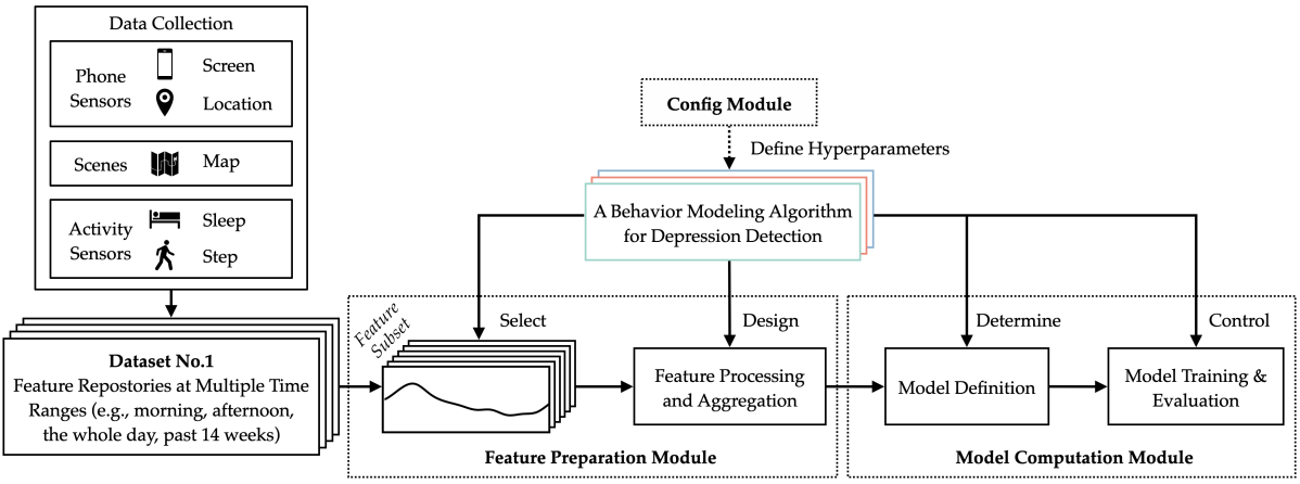 최근 스마트폰과 웨어러블 디바이스의 발전으로 사용자의 일상 행동의 다양한 측면을 센서 데이터를 이용해 모델링할 수 있게 되었고, 이 연구는 우울증 예측을 위한 일반화(Generalization) 모델 구축의 가능성을 알아보았다. 저자들은 이전 연구에서 제시된 대부분의 알고리즘이 한 인구 집단에서 짧은 기간 동안 수집된 단일 데이터셋만을 이용해서 평가된 점을 지적했고, 일반화가 가능한 즉 실제적이고 유용한 배포가 가능한 모델 구축을 위해서는 여러 데이터셋에 걸쳐 모델을 평가하는 것이 필수적이라고 이야기한다. 따라서, 그들은 두 개의 서로 다른 기관에서 2년 이상의 기간 동안 데이터를 수집했고, 그렇게 얻어진 4개의 데이터셋을 이용해 이전 연구들에서 제시된 우울증 예측 모델의 성능을 평가했다. 이는 1개의 데이터를 이용해 학습된 모델을 다른 3개의 데이터셋을 이용해 평가하는 cross-dataset 방식으로 이루어졌는데, 대부분의 모델은 큰 성능 저하를 보이며 일반화 가능성 부족을 나타냈다. 뿐만 아니라, 다른 도메인으로부터 얻은 지식을 새로운 타겟 도메인에 재활용할 수 있도록 하는 도메인 일반화(Domain Generalizable)를 위해 개발된 컴퓨터 비전 혹은 자연어 처리 분야의 딥러닝 알고리즘들을 이용한 평가도 진행했는데, 이들 역시 일반화 가능한 우울증 예측 모델에는 적합하지 않음을 보였다. 이어서 저자들은 두 가지의 새로운 알고리즘을 직접 제시했고, 그중 우울증 예측 작업(task)과 동시에 데이터의 시간적 재순서화(temporal reordering) 작업을 진행하는 Reorder 알고리즘은 평가한 모든 알고리즘 중 가장 강력한 일반화 성능을 보였다. 해당 논문은, 사용자 행동 모델링 분야 연구자들이 자신들의 모델을 개발하고 평가할 수 있는 오픈소스 벤치마크 플랫폼인 GLOBEM을 소개하며 마무리된다.