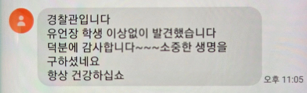 난 진심을 다해 기도를 하고 난 뒤에 초조하게 기다렸다. 경찰분은 전화가 거의 끝나서 전화를 돌려주었다. 전화를 다시 받자마자 그 아버지 분은 울면서 감사하다는 말을 계속하였다. 나는 아니라고 하며 기도하겠다는 말을 하였다. 그렇게 전화를 끊고 경찰분들이 나에게 감사하다고 말하여 주었다. 나는 용기를 내서 " 그분을 무사히 찾게 된다면 저에게 문자하나만 해주실 수 있나요? "라고 말하였다. 경찰분들은 흔쾌히 알겠다고 하며 내 번호를 받아서 경찰차를 타고 가셨다. 그렇게 난 집으로 들어가서 씻고 잘 준비를 분주하게 마치고 침대에 앉아서 다시 한번 기도를 하였다. 가족을 떠나보낸다는 게 얼마나 힘들고 슬픈지 알기에 나는 더욱 간절하게 기도하였다. 그때 나는 자기 전에 폰을 확인해 보니 2개의 문자가 와 있었다.