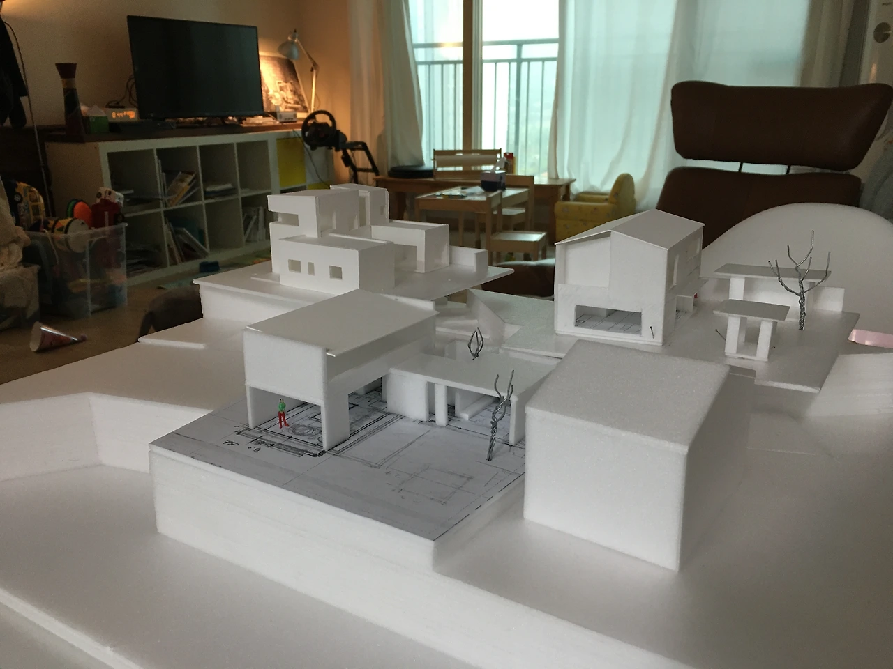 남편은 설계가 끝날 때마다 모형을 만들었다. 스케치업 화면과 크게 다를까 싶었는데 실물 크기를 그대로 줄여 만든 모형은 집을 객관적으로 보게 해주었다. 분명 컴퓨터 화면에서는 좋아 보였는데 막상 모형을 만들어 앉혀 보니 생각했던 것과 다른 경우도 있었다. 우리 집만 떼어 놓고 보면 괜찮지만 이웃집과 어우러지지 못하거나 땅과 묘한 긴장감을 형성하기도 했다. 폼보드로 거칠게 만든 모형인데도 이렇게 보니 다르다며 감탄했더니 남편이 말했다.