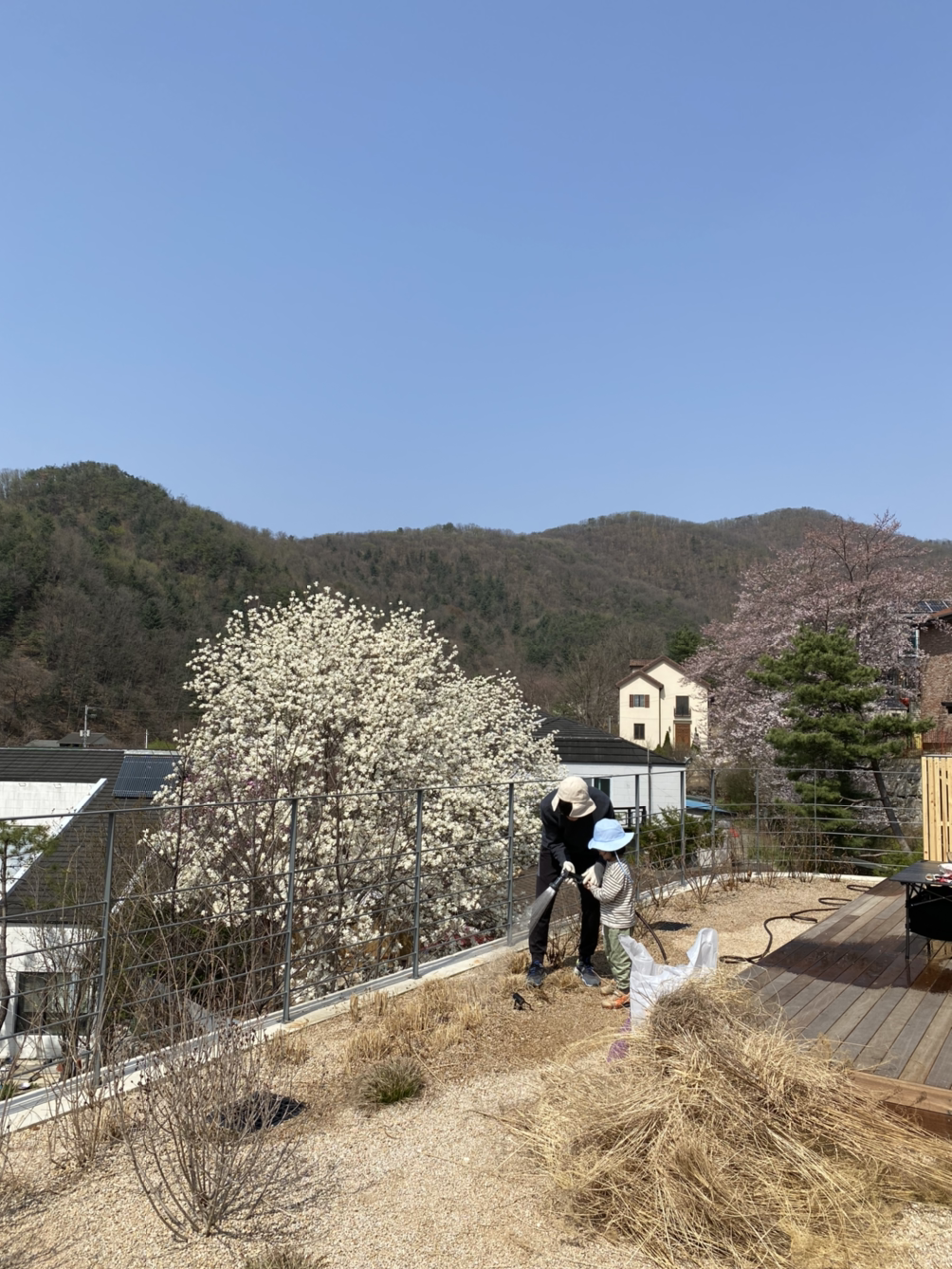 겨우내 마당을 지켜준 그라스는 새로 자랄 수 있도록 아랫부분을 잘라준다. 봄이 되어 날이 풀리면서 데크에 있는 시간도 길어진다. 테이블과 캠핑의자 세 개를 아예 데크에 내놓고 주말이면 삼시 세 끼를 모두 밖에서 먹기도 한다.
