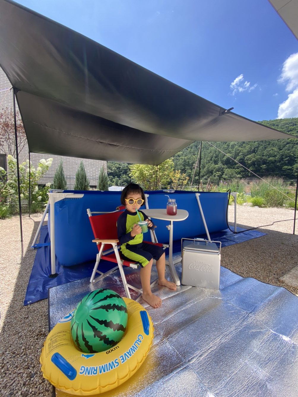 여름에는 수영장을 설치한다. 수영장을 살까 말까 고민하다가 8월이 되어서야 샀는데 올해 산 물건 중 가장 잘 썼다. 얼마나 쓰겠나 싶어 망설이다가 결정이 늦어졌다. 아이도 좋아하고, 남편과 나도 기대 이상으로 만족한다. 어린이집에서 하원하면 바로 수영복으로 갈아입고 해가 질 때까지 두어 시간 물에 들어가 아이와 같이 논다. 해가 강할 때는 타프를 쳐서 그늘을 만들고, 간단한 음료를 아이스박스에 넣어 나들이 기분을 낸다.