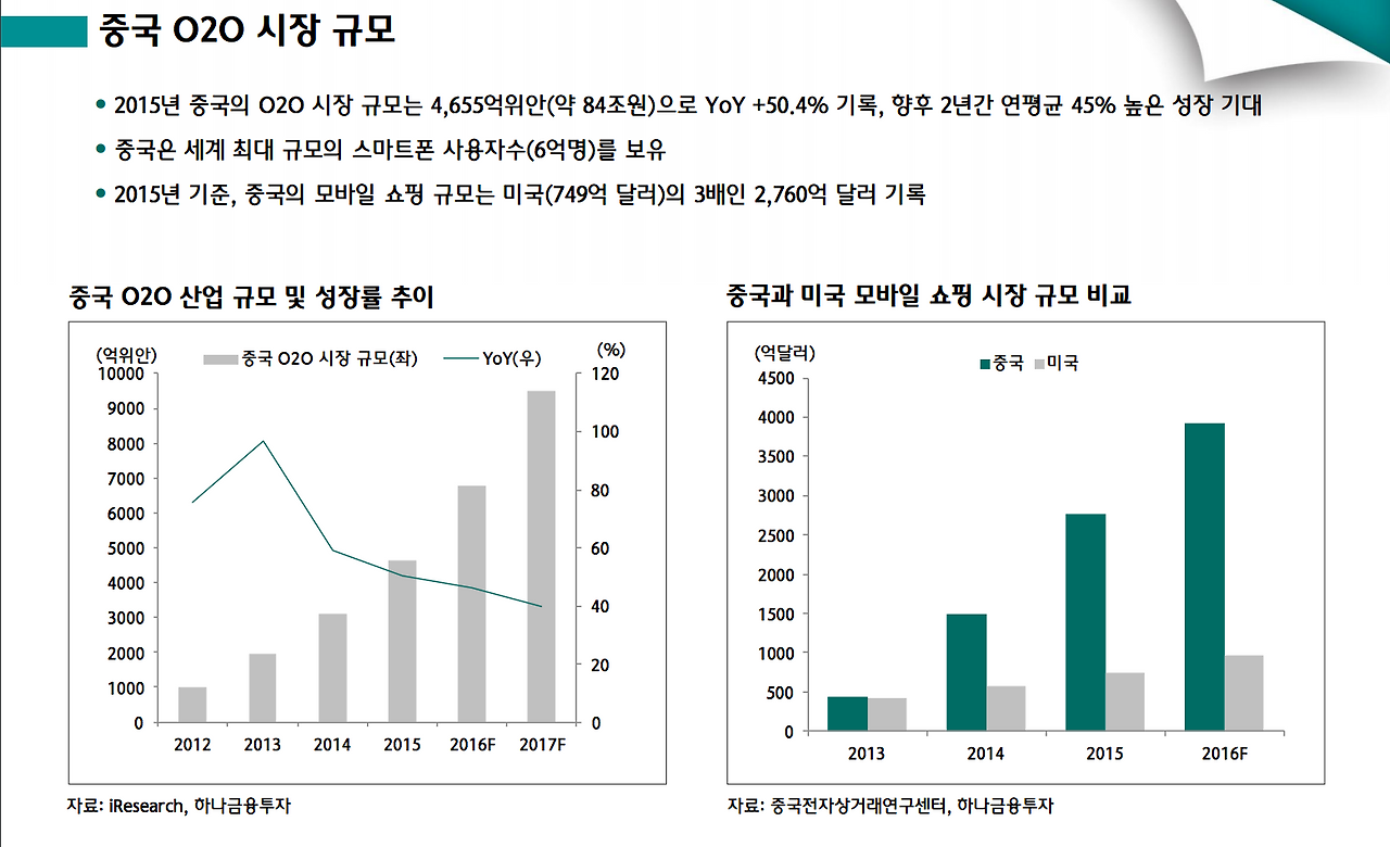 중국 정부의 정책적 지원 속에서 중국 O2O 시장은 2015년 약 84조원 규모로 성장합니다. 중국의 O2O는 향후 매년 45%의 성장이 예상되며, 중국 내에서 O2O 고속 성장은 아직도 현재 진행형을 보이고 있습니다.