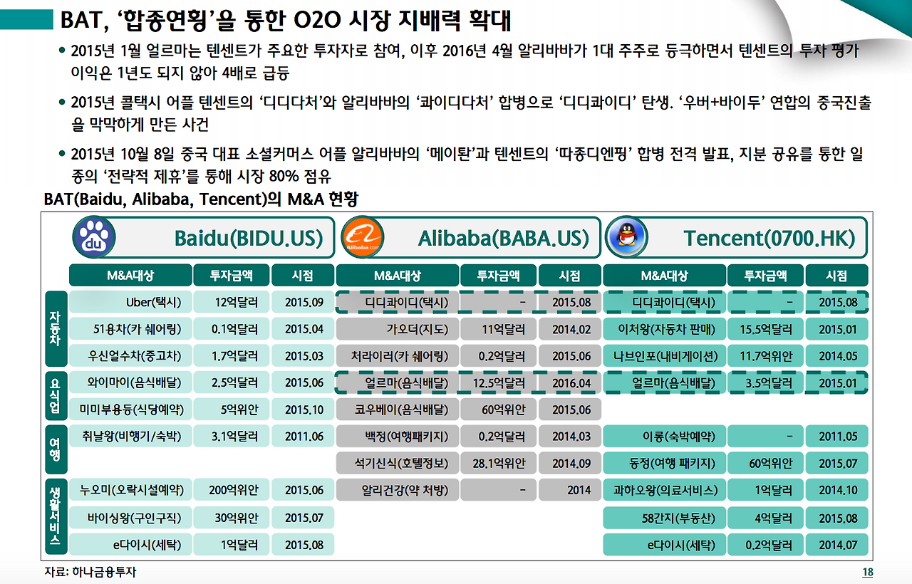 중국은 알리바바, 바이두, 텐센트라는 인터넷 3강이 격전을 벌이면서 O2O 시장을 키워나가고 있습니다(https://brunch.co.kr/@kakao-it/8). 중국에서 O2O 경쟁은 한 단위의 산업이 아니라, O2O 패밀리가 창출해 내는 생활의 가치에 의해 좌우되고 있습니다. 이에, 인터넷 3강은 자신의 O2O 클러스터에 부족한 부분을 메우기 위해 적극적인 인수합병 전략을 펼치고 있다고 조 센터장은 설명했습니다.
