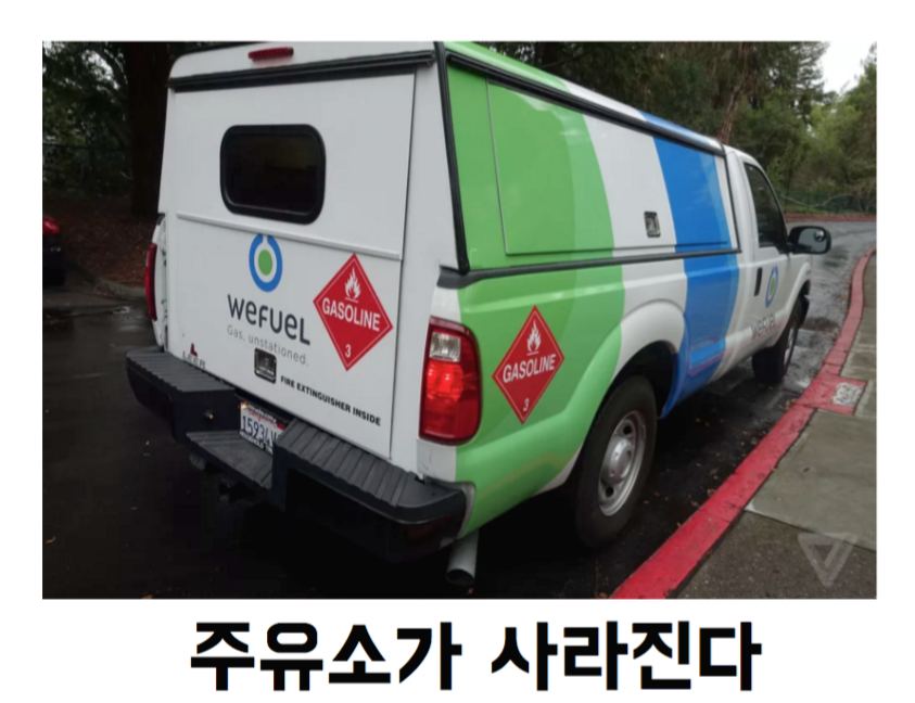 위 사진은 차에 기름을 채운 뒤, 움직이면서 기름을 파는 '이동 주유소' 입니다. 사실, 주유소는 대표적인 부동산 기반의 사업입니다. 차가 많이 지나다니는 곳에 위치해야 돈을 많이 벌 수 있습니다. 돈이 없다면, 좋은 위치에 주유소를 차릴 수 없는 구조인 셈입니다. "정기적으로 기름을 구입하는 소비자들의 수가 규모의 경제를 이룰 정도가 되면, 굳이 특정 위치에 고정된 주유소를 차릴 이유는 없다"라는 게 미국의 이동 주유소 업자들의 전략이라고 임 센터장은 소개했습니다.