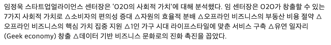"한국, 중국에서는 O2O라고 칭하지만, 미국에서는 온 디맨드로 불린다. (앱을) 누르면 (소비자에게) 온다는 의미에서다. (O2O 체계 하에서) 스마트폰이 알라딘 램프처럼 (소비자가 원하는 일을) 해주는 사회가 되고 있다."