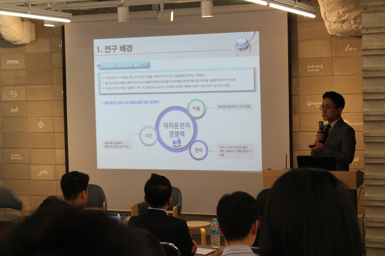 김현명 교수는 버스, 도로, 철도 등의 수요와 공급을 연구하는 학자입니다. 김 교수는 명지대 교통계획연구실의 실장을 역임하고 있으며, 국내의 몇 안 되는 택시 전문가이기도 합니다. 대리운전의 법적 지위가 없는 국내의 일부 관공서에 대리운전은 택시와 함께 관리되고 있기도 합니다. 대리운전은 시장 규모가 얼마인지도 정확하게 추산되지 못하는 교통분야의 구멍입니다. 김 교수는 기존의 콜 대리(전화 중심의 예약 방식)과 다른 앱 대리(애플리케이션 기반의 예약 방식)에 내재된 소비자 후생 효과를 분석한 연구 결과를 이번 세미나에서 발표했습니다.