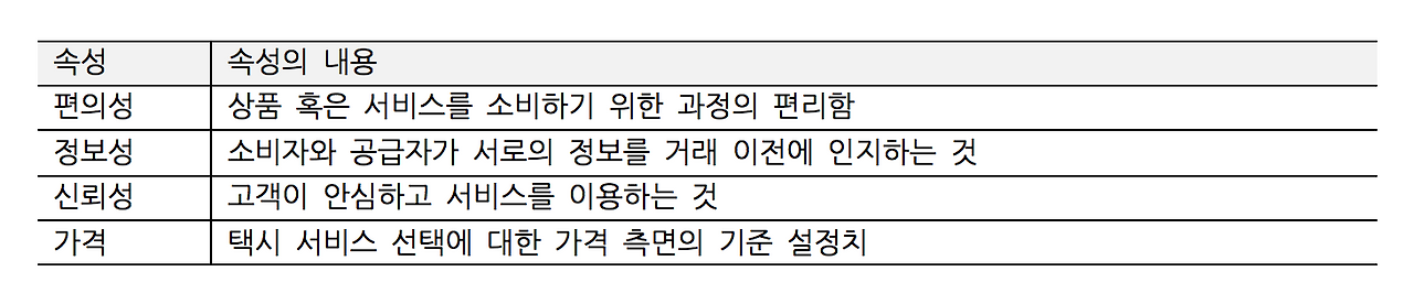 본 연구에서는 기존의 택시와 카카오택시의 속성이 적용된 택시 서비스의 비교를 위해 기본요금을 중심으로 한 연구 모형을 설계했습니다. 택시 서비스의 비교를 위한 기준 속성과 각 속성의 내용은 아래와 같습니다.