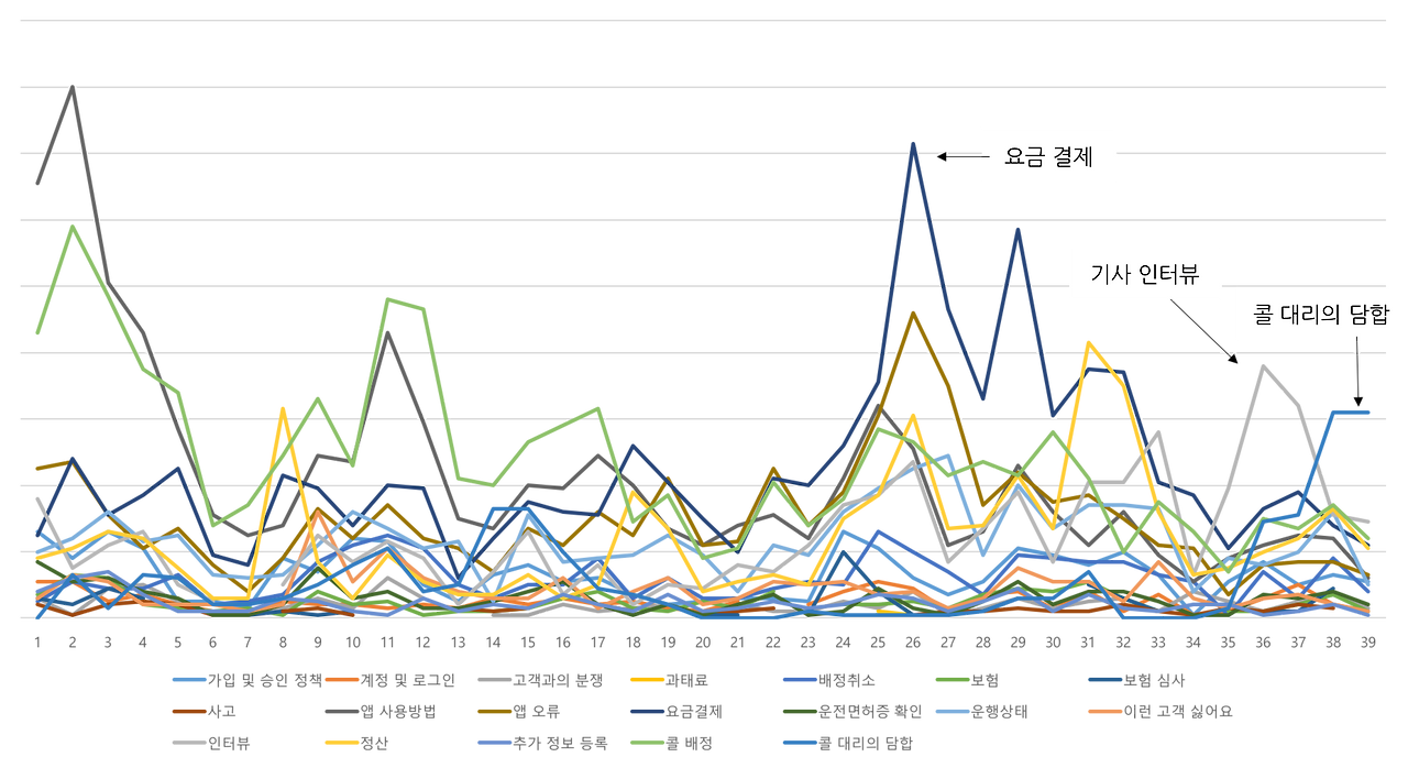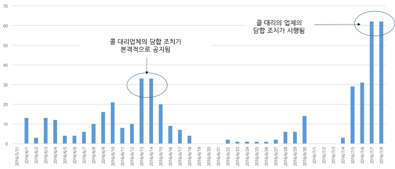 그런데 어느 순간부터 낯선 민원이 대리운전기사부터 카카오드라이버에 물밀듯이 들어오기 시작합니다. 아래 그림에서 7월 5일부터 급격하게 상승하는 '민원'을 보실 수 있을 겁니다. 콜 대리의 담합과 관련된 민원이었습니다. 이는 카카오드라이버를 쓴다는 이유로 강제로 회원 자격을 박탈하거나 콜을 늦게 주는 경우 등 기존의 콜 대리업체가 공동으로 카카오드라이버를 이용하는 대리운전기사들에게 불이익을 준 데 대한 하소연으로 볼 수 있습니다. 콜 대리의 답합은 O2O 시장에 내재해 있는 핵심 층(layer)의 존재에 대한 힌트가 됩니다.