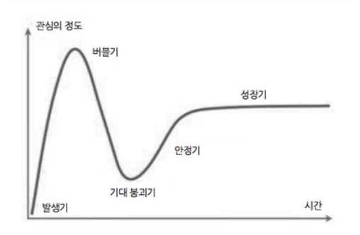 신기술이 사회에 안착되는 과정에서 신기술에 대한 관심의 양상을 두고, 글로벌 시장조사업체인 가트너(Gartner)는 하이프(Hype) 현상이란 모델로 규정했습니다. 신기술이 사회에 도입된 후 그에 대한 사회적 관심 규모의 추이가 아래와 같은 주기를 보인다고 하이프 현상에서는 설명합니다.