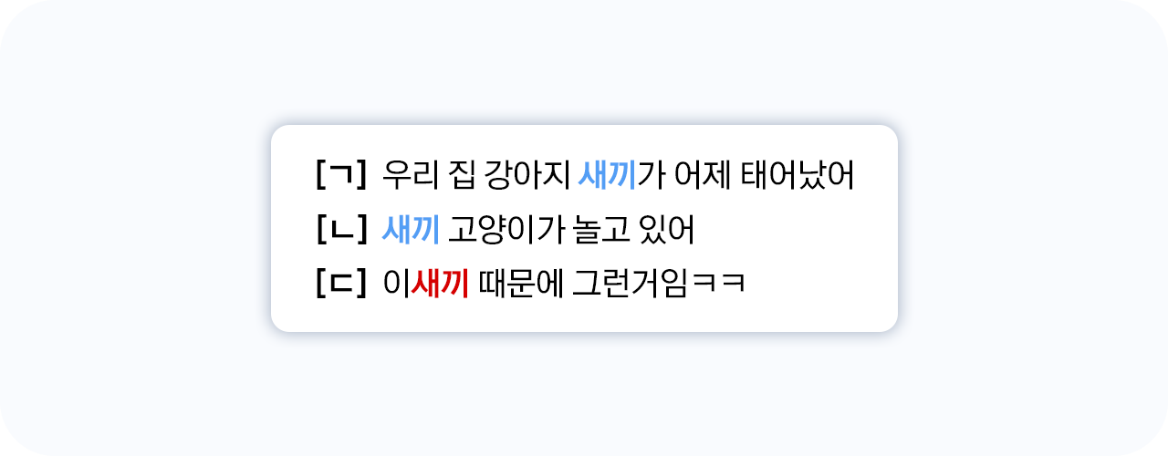 <그림3: 세이프봇은 ‘낳은 지 얼마 되지 않은 어린 동물’을 의미하는지 ‘어떤 사람을 욕하여 이르는 말’인지 문맥을 이해합니다. 이에 따라 (ㄱ),(ㄴ) 문장에서 사용된 단어는 가리지 않고 (ㄷ)문장에서만 해당 단어를 가리기 대상으로 판단합니다.>