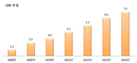 중국 무선 인터넷 사용자 수는 2009년 급증합니다. 2009년에 전년 동기 대비 109.1% 성장한 이후, 중국의 연도 별 무선 인터넷 사용자 증가율은 30% 안팎을 유지합니다. 증폭한 무선 인터넷 사용자 수는 O2O 성장의 토대가 됩니다.