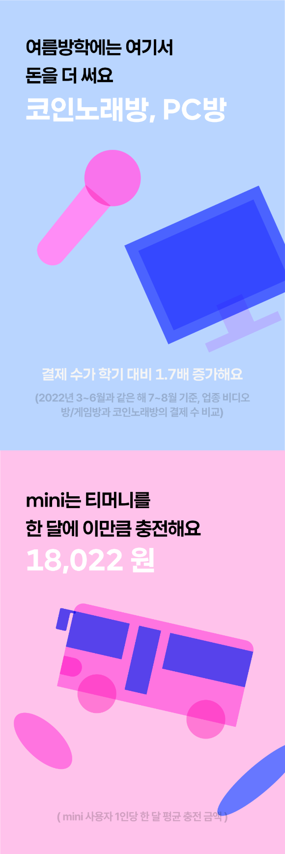 ■ 지금 mini를 쓰는 이용자는 총 150만 명, 전체 청소년 중 65% 정도입니다. 10대의 자유로운 금융 생활을 든든하게 책임지고 있죠. 그런 만큼 mini카드의 결제 데이터엔 10대 친구들의 씀씀이가 고스란히 담겨 있어요. 어른들과 비슷하면서도 또 다른 mini만의 소비 생활은 어떤지, 한 번 살펴볼까요.