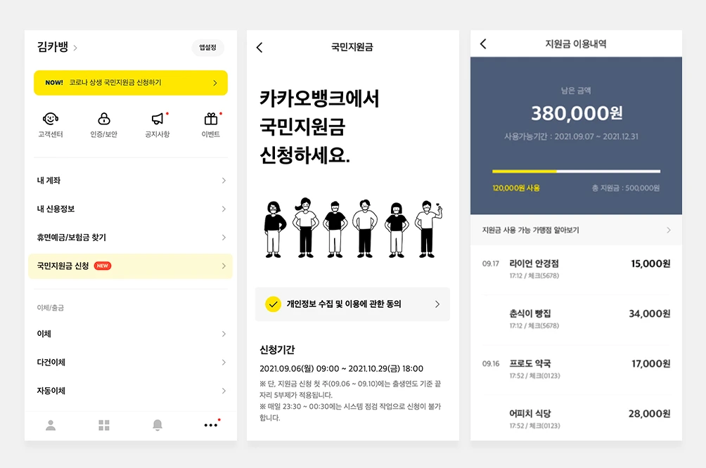 9월 6일, 카카오뱅크 앱에 국민지원금 메뉴가 열릴거예요! 국민지원금 메뉴로 들어가 지원 대상 여부 및 지원 예상 금액을 확인하고, 신청하기 버튼을 누르면 끝!