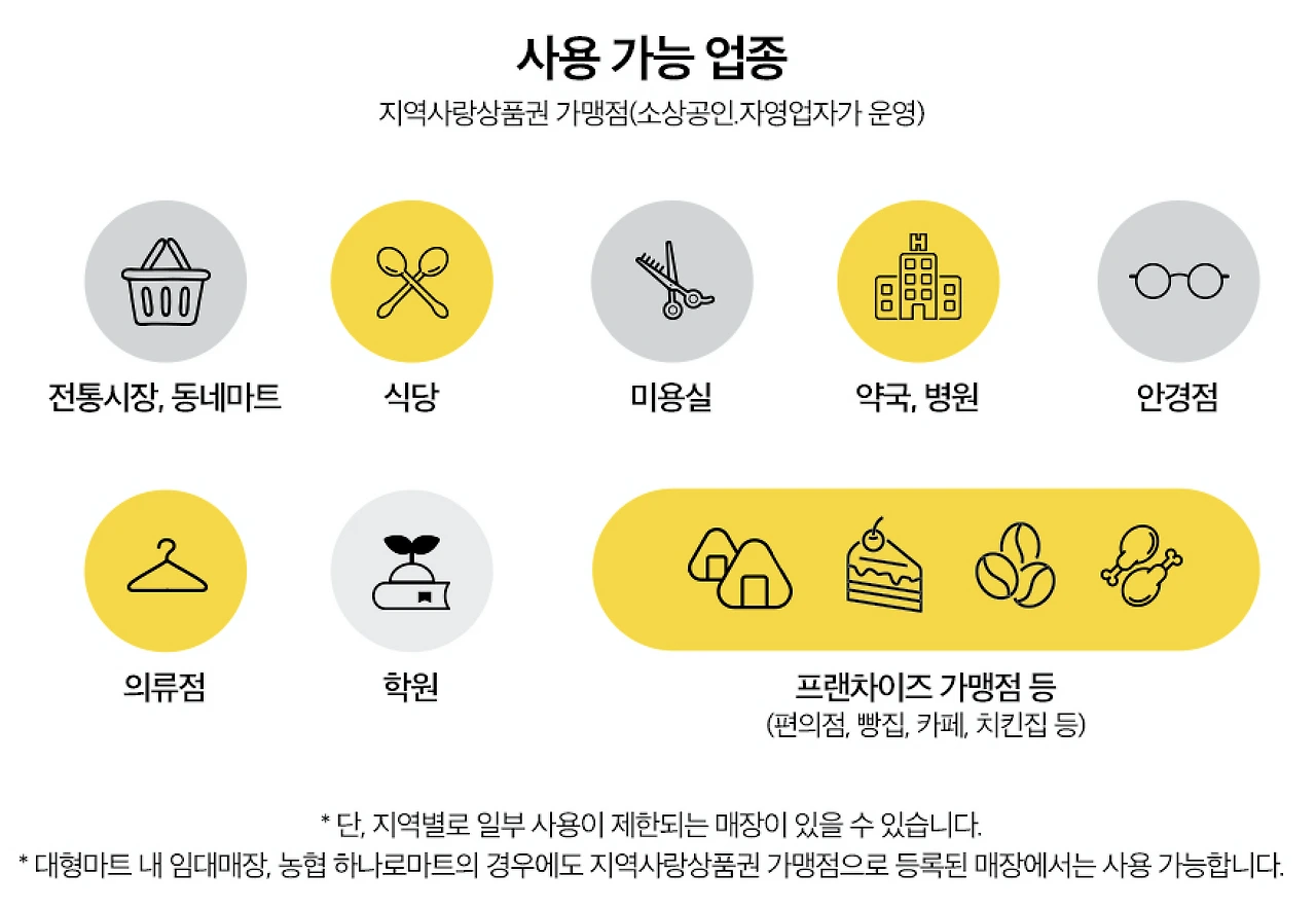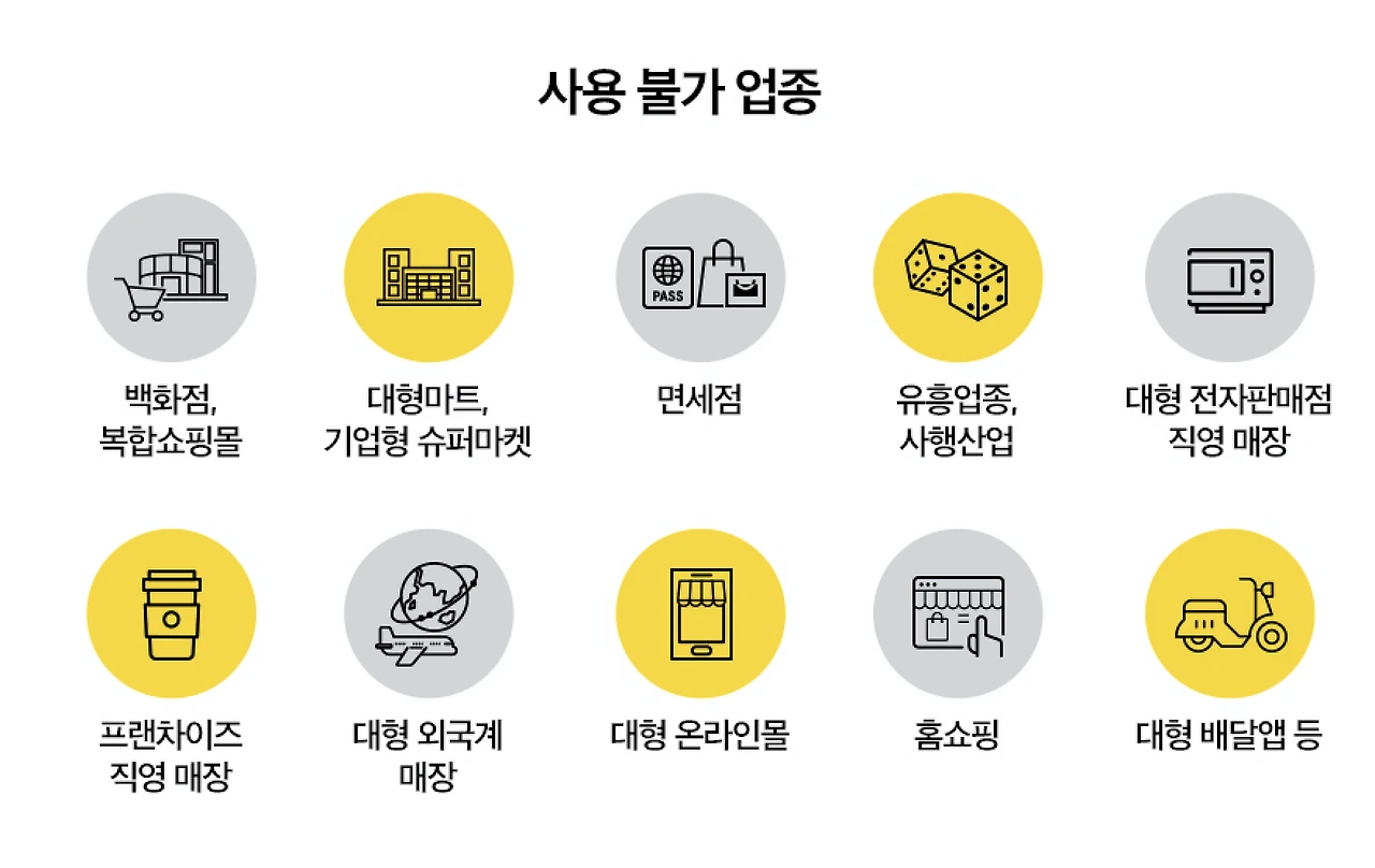 하지만 프랜차이즈라도 스타벅스 같은 본사가 운영하는 직영점, 대형 외국계 매장, 백화점, 복합쇼핑몰, 면세점, 홈쇼핑, 유흥업종 등에선 사용할 수 없어요. 단, 배달앱은 앱 내에서는 사용할 수 없고, 현장(만나서)에서 가맹점 자체 단말기로 결제한다면 쓸 수 있습니다.