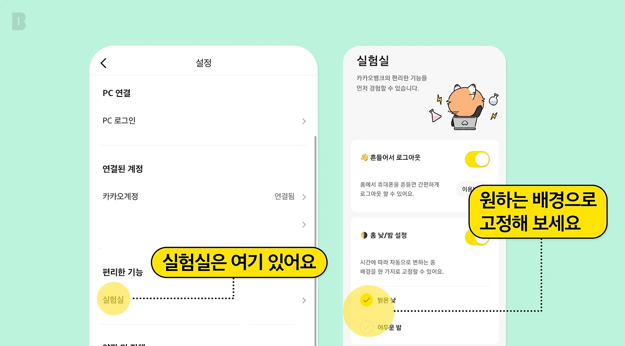 카카오뱅크의 홈 화면은 시간에 따라 자동으로 배경이 밝고 어둡게 변하는데요. 원한다면 배경을 밝게 또는 어둡게 고정하는 방법도 있어요.